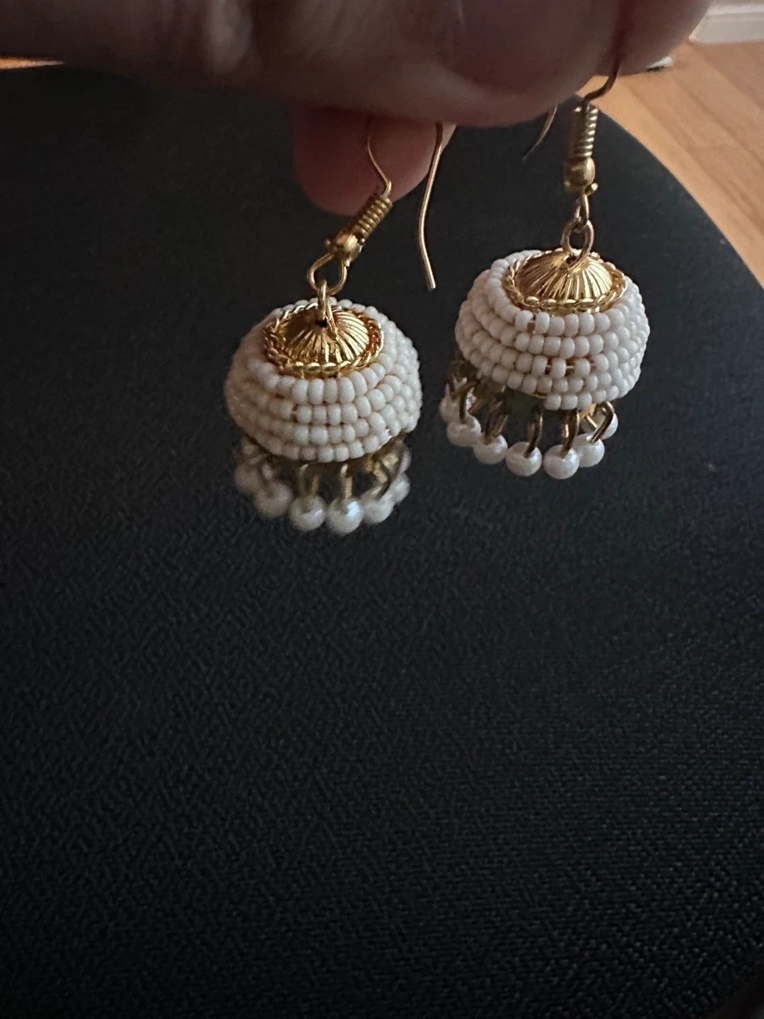 White Beaded Jhumka Earrings with Gold Tone Accents