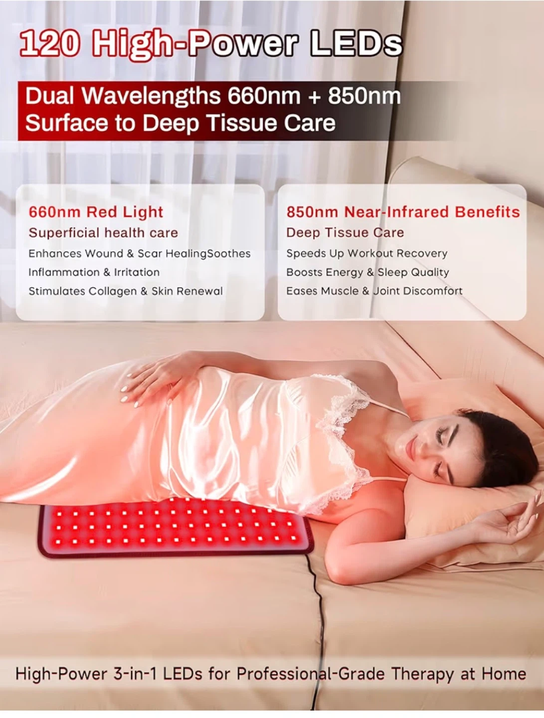 This device uses dual wavelengths, 660nm red light and 850nm near-infrared, for surface to deep tissue care. It offers superficial health care benefits like enhanced wound healing and collagen stimulation. It also provides deep tissue benefits such as faster workout recovery and relief from muscle & joint discomfort.