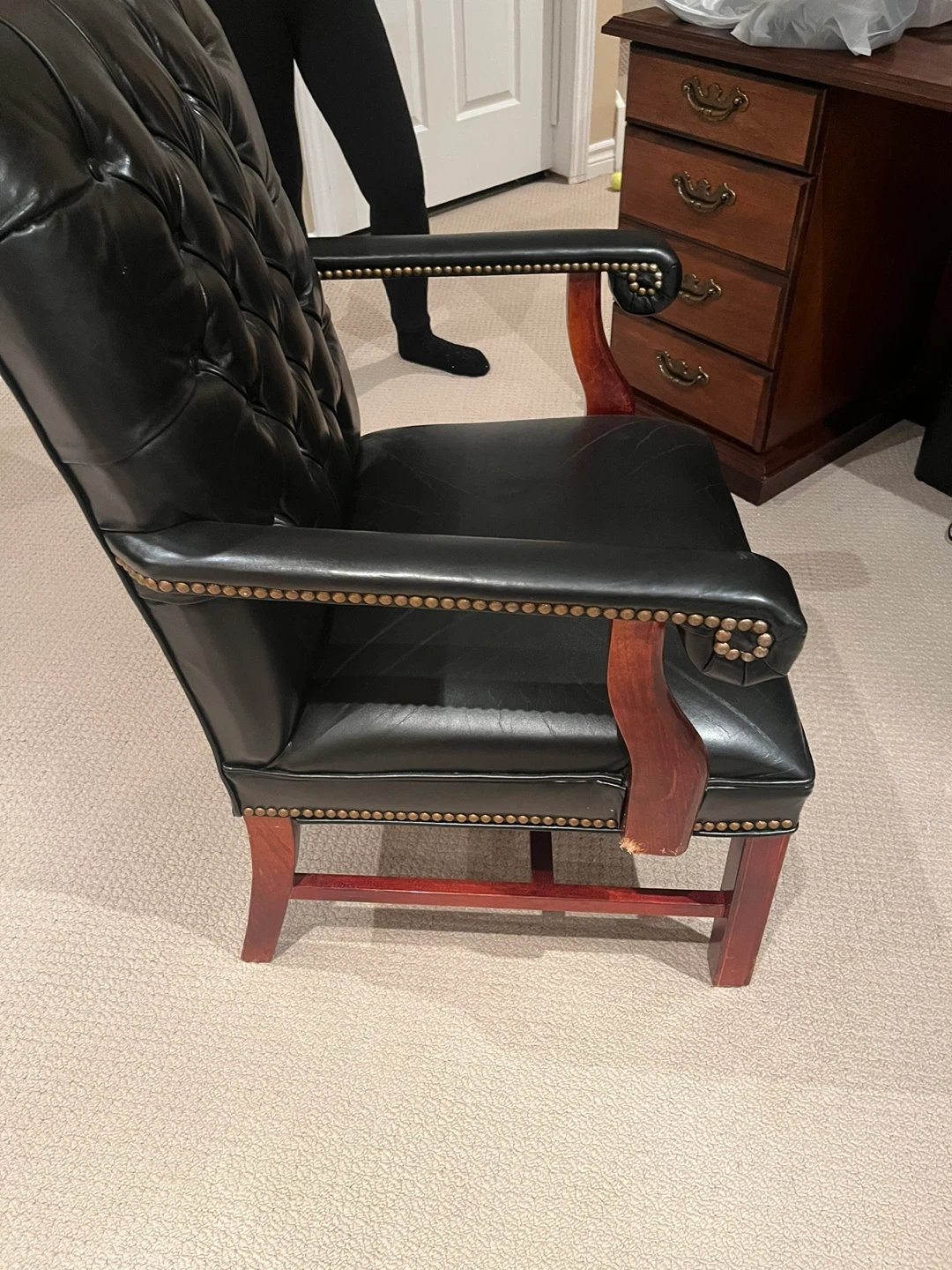 This is a comfortable black leather executive office chair. It features a tufted back and studded armrests. Great for a home office or study!