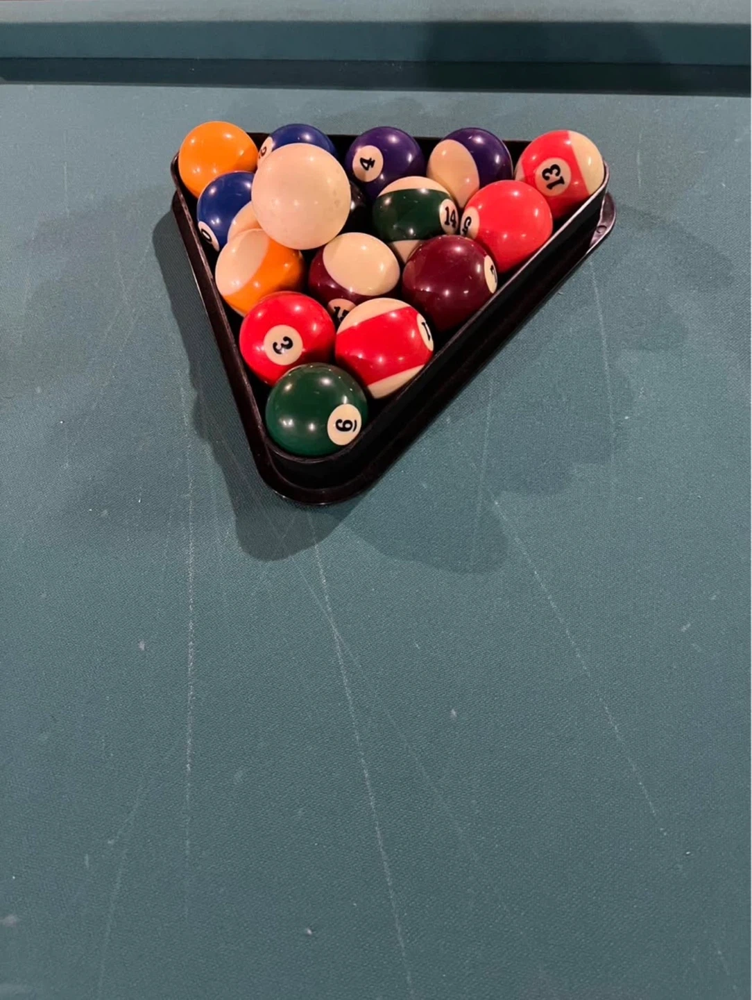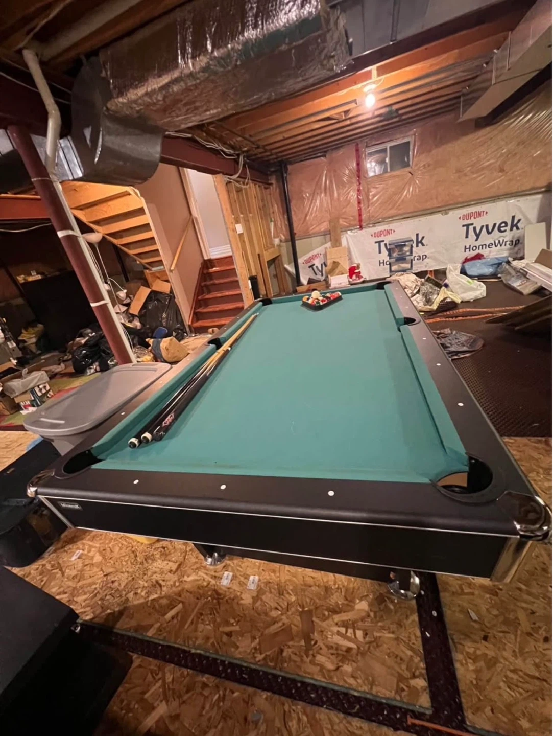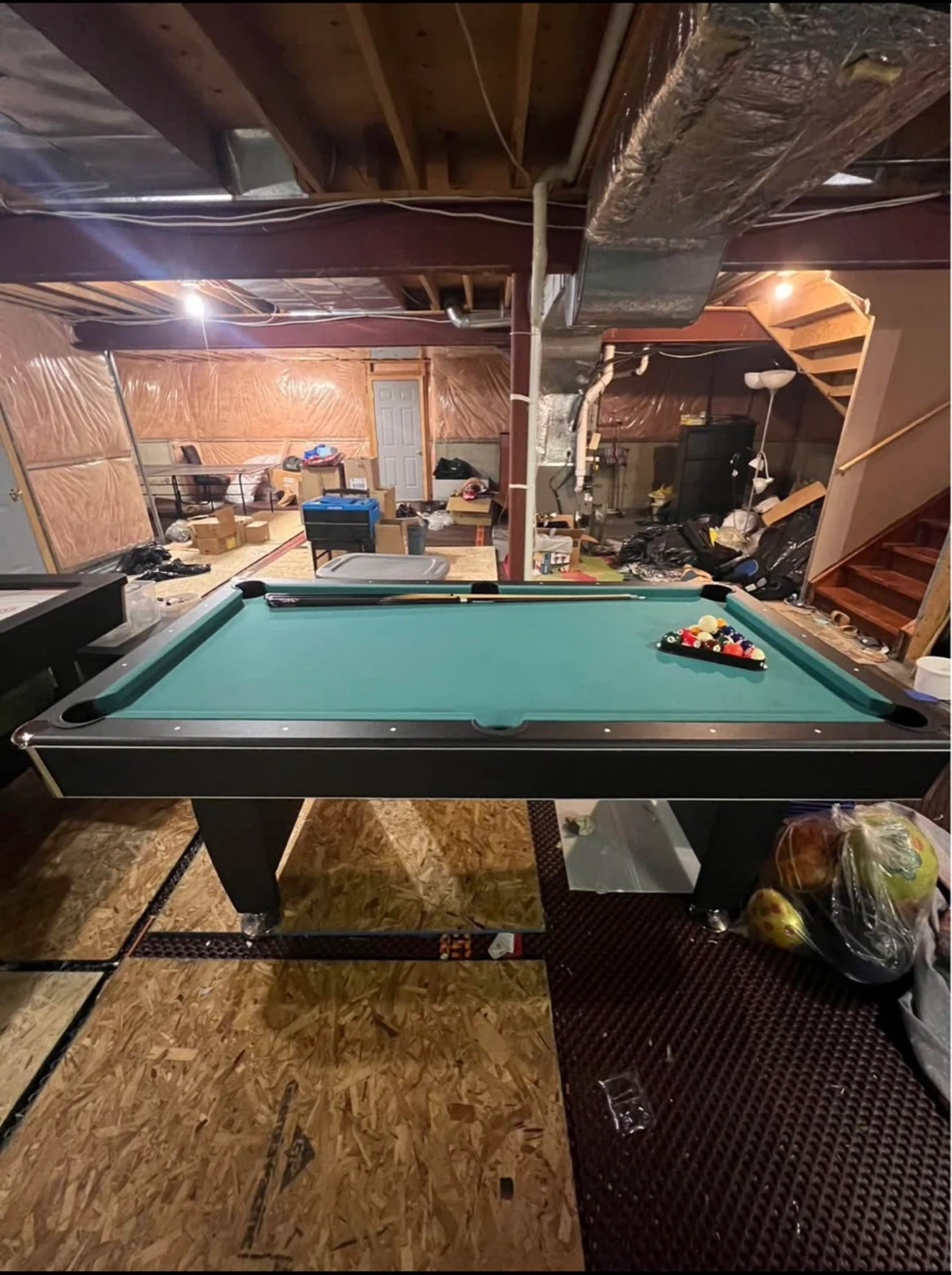 This is a pool table with a green felt surface. It comes with three cues and a set of pool balls. The table has black rails and pockets. It's ready for a game night!