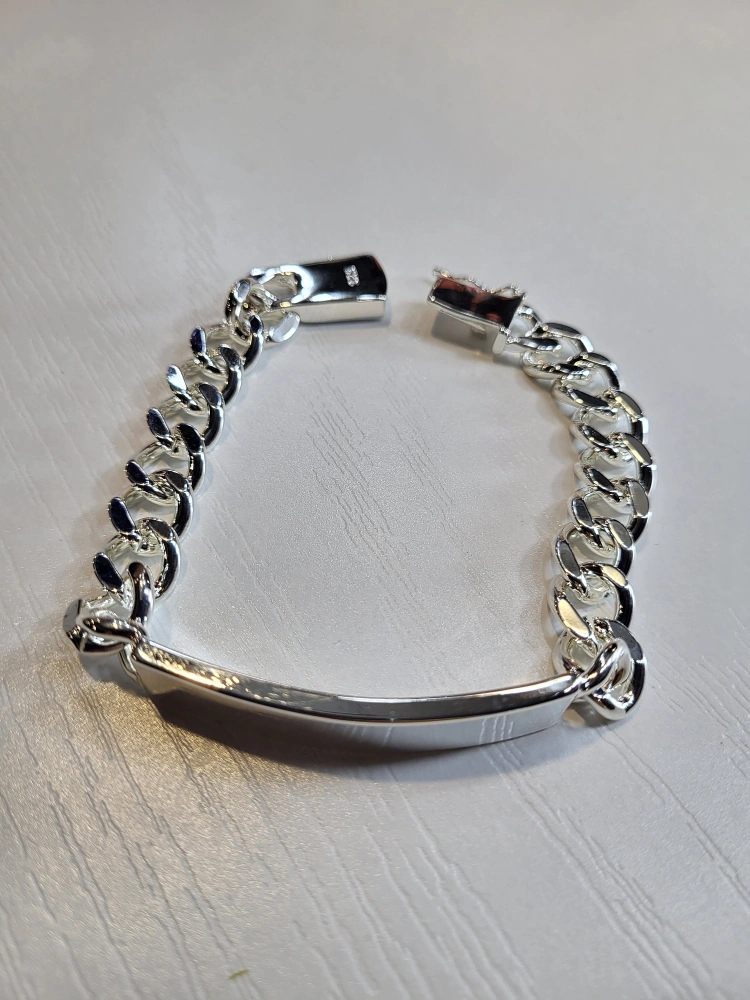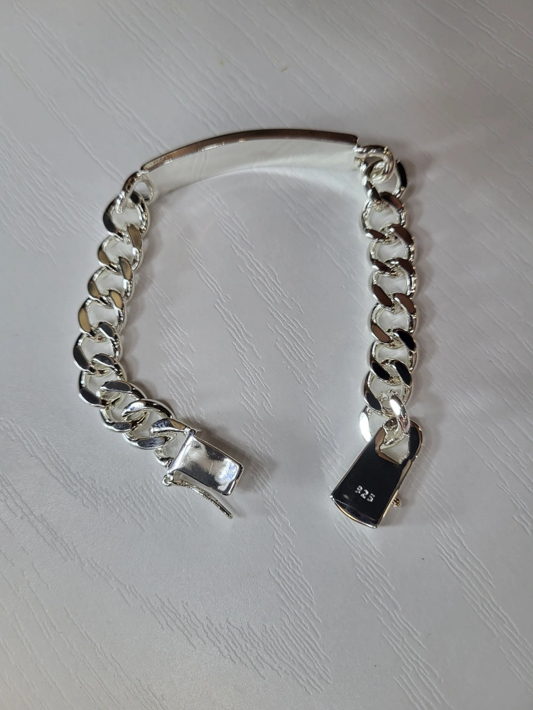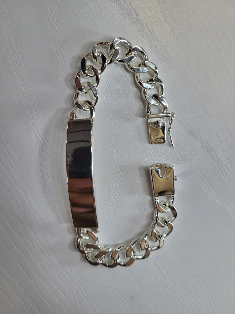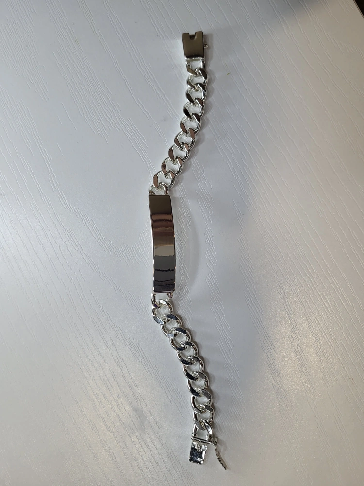 Beautiful silver bracelet. Features a curb chain and a rectangular plate. Clasp closure. Wearing jewelry can be a form of self-care.