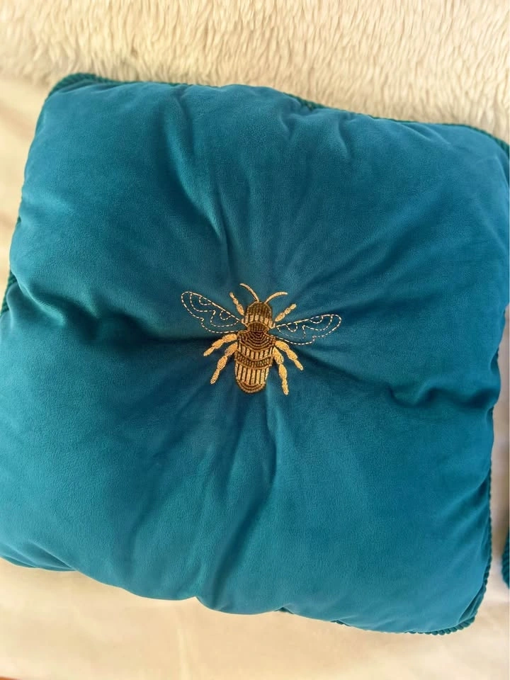 Beautiful turquoise and gold bee pillows. Purchased them from Manchester, England. Non-smoking, no-pet home. Selling because I'm moving. White throw blankets in the background are also on sale.