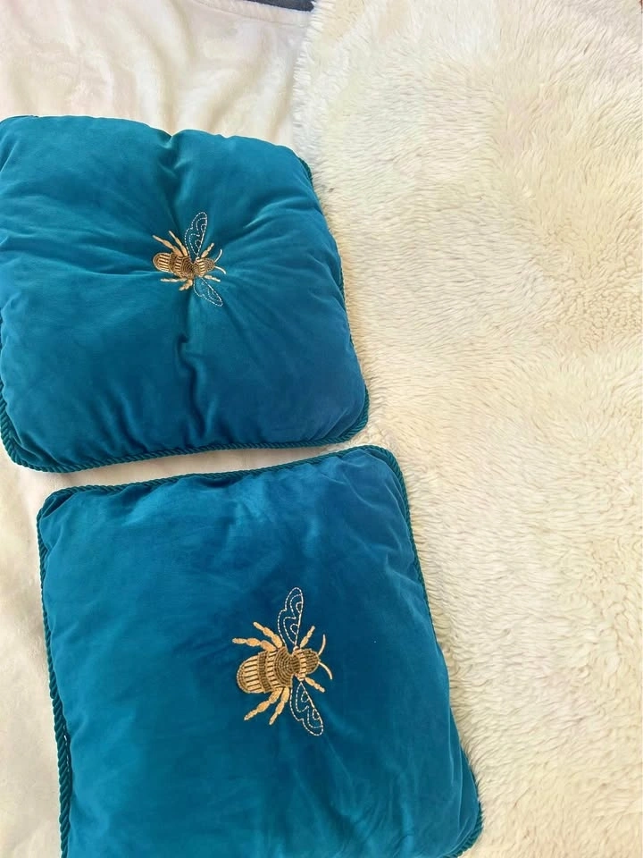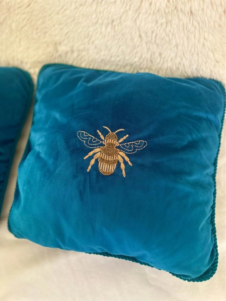 Beautiful turquoise and gold bee pillows. Purchased them from Manchester, England. Non-smoking, no-pet home. Selling because I'm moving. White throw blankets in the background are also on sale.