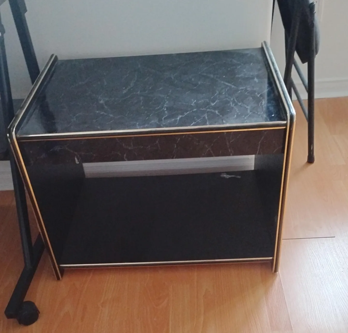 Selling a black side table with a marble top. It features a sleek design with gold trim. Perfect as a nightstand or accent table in any room!