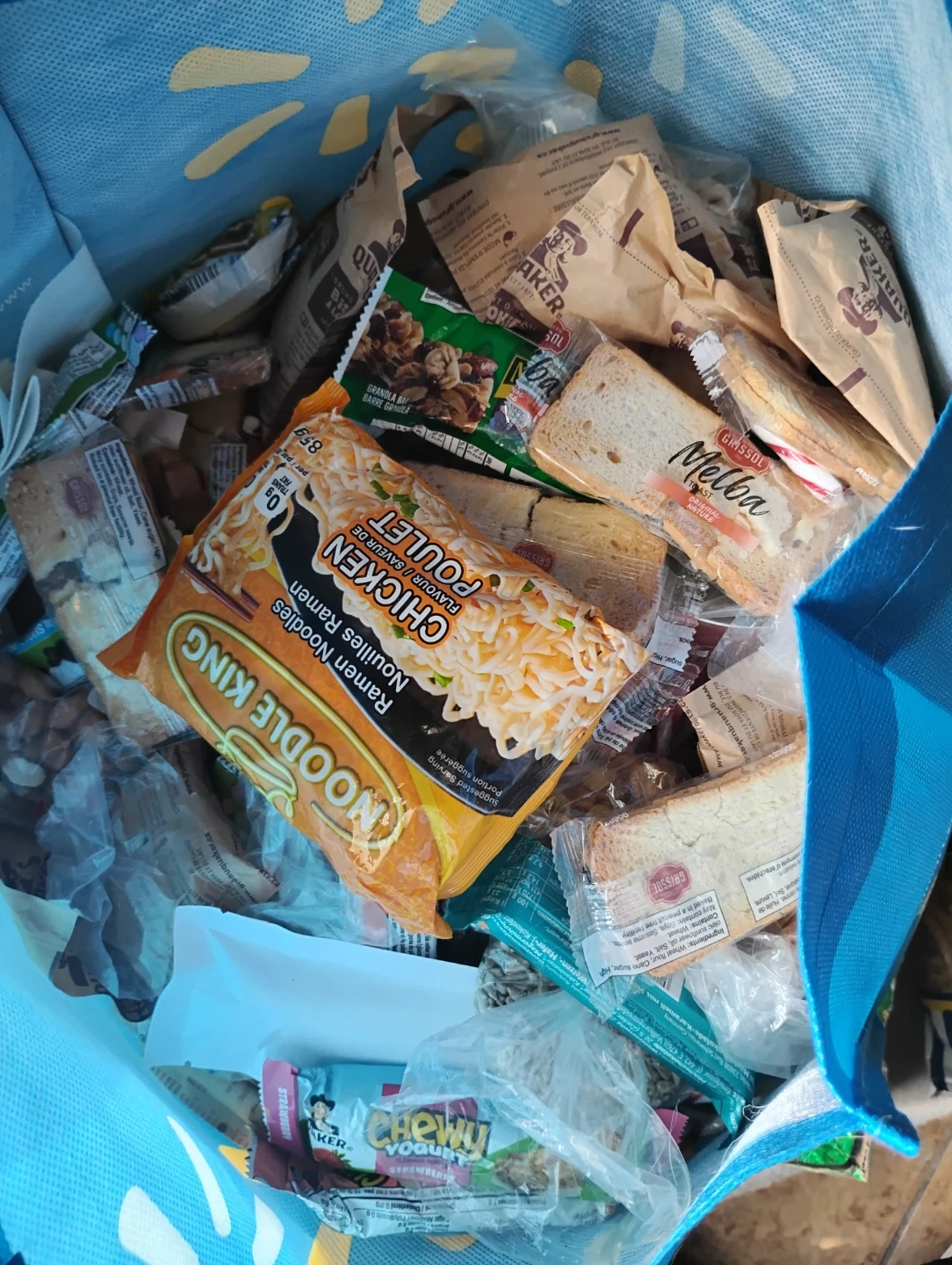 Contains a Noodle King Chicken flavour ramen pack and various other snacks. Items include Melba Toast, Quaker Chewy Yogurt bars, and granola bars. This assortment is great for quick meals and on-the-go snacking. This is a random bag of food and will be throwing in some frozen food as well, pickup only! Fairway area.