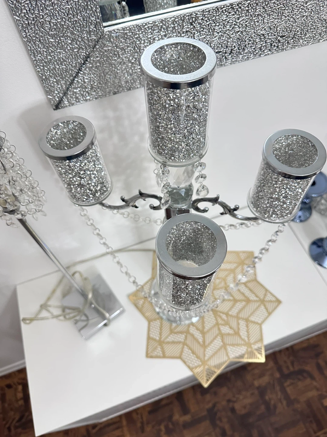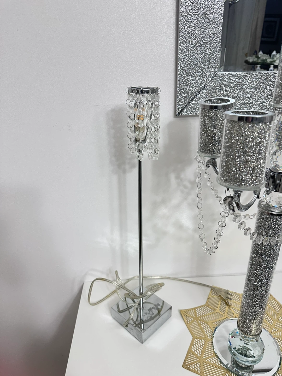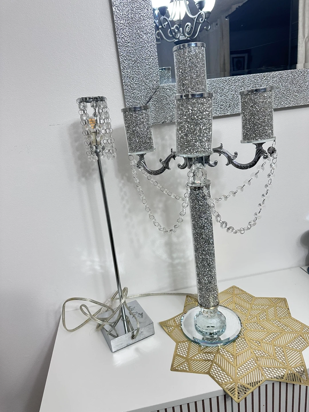 This sparkly candelabra features a silver-toned metal frame adorned with clear crystals and crushed mirror accents. It has five arms for candles and hangs with beaded crystal chains. Comes with a matching small crystal accent lamp with a square base. It's a dazzling set for adding glamour!