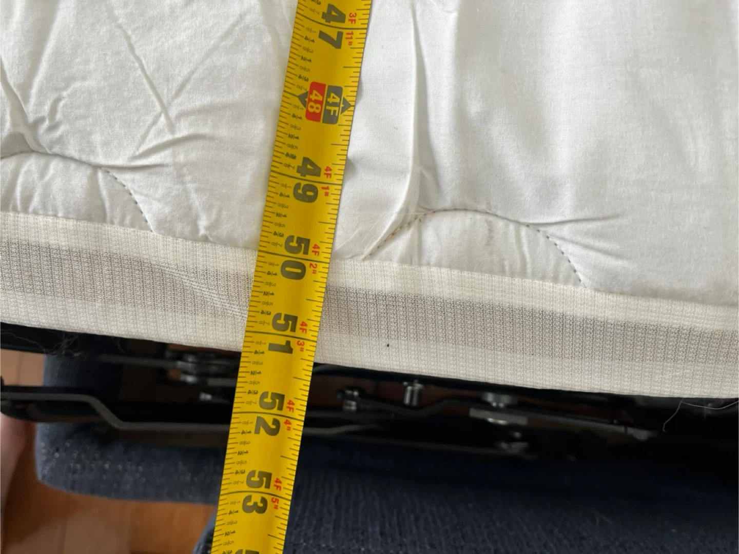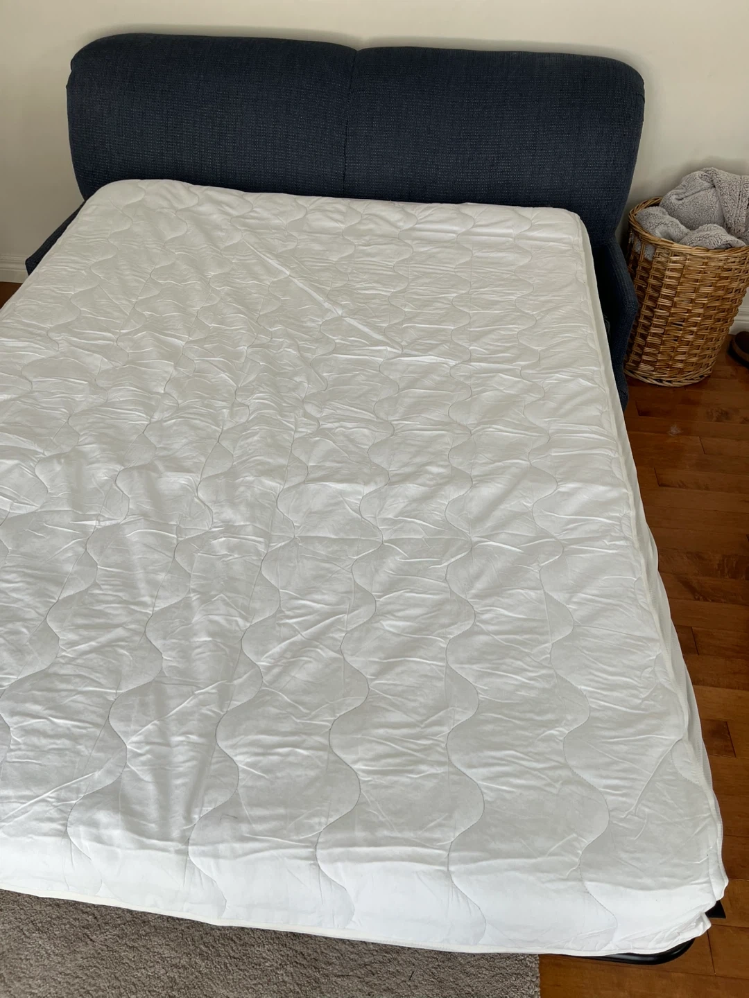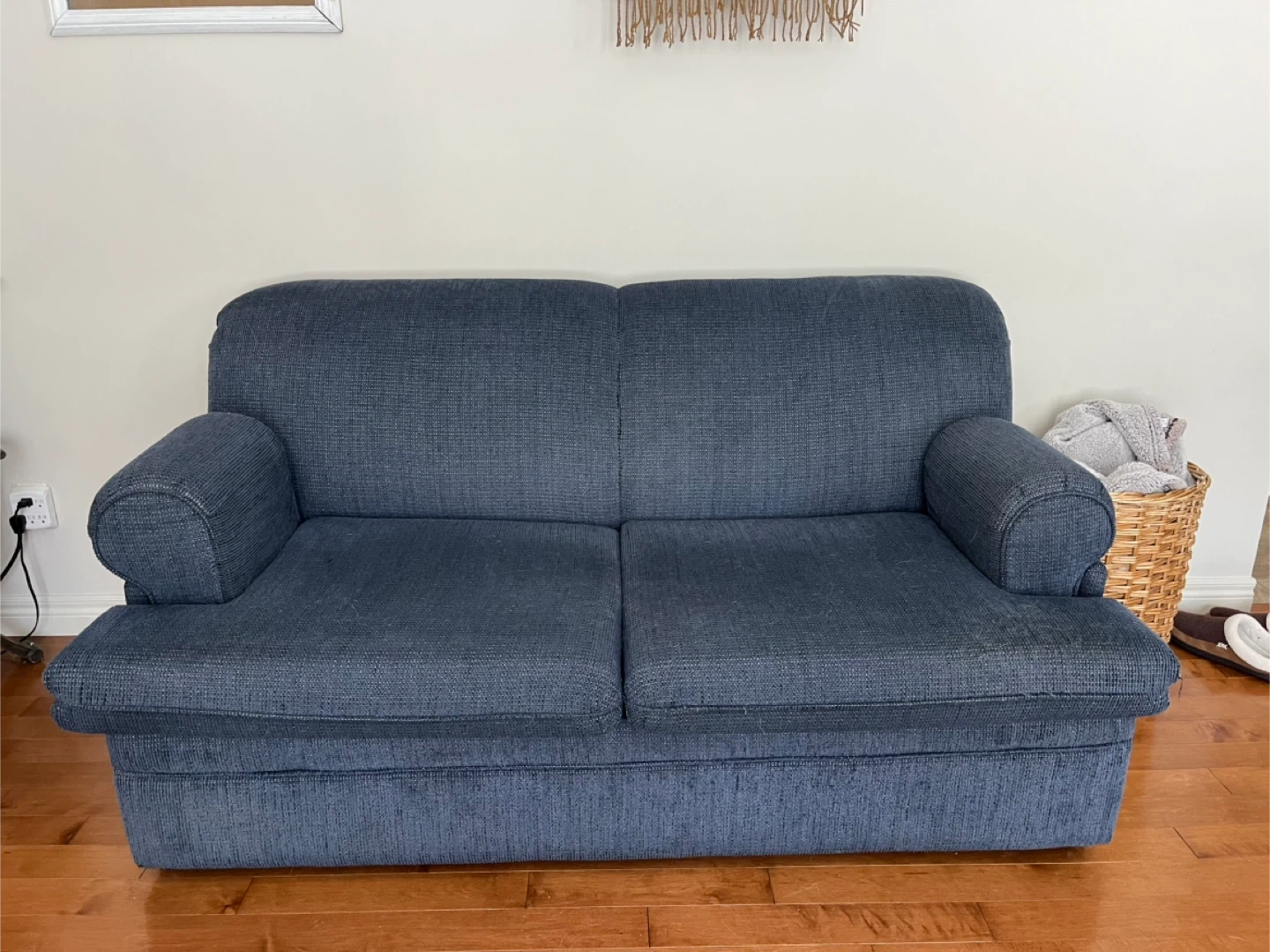 Blue fabric sofa that converts into a double bed. Mattress pad included. Dimensions approximately 55" wide by 30" deep when used as a sofa. Mattress measures roughly 50" wide. Originally from Lounsbury Fruniture.