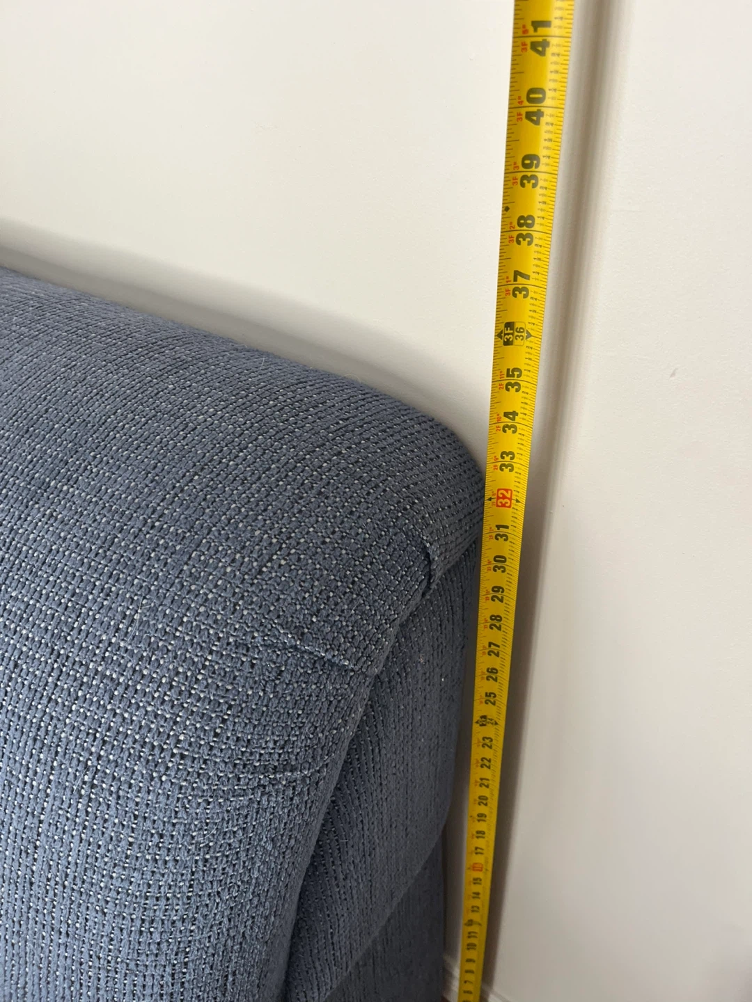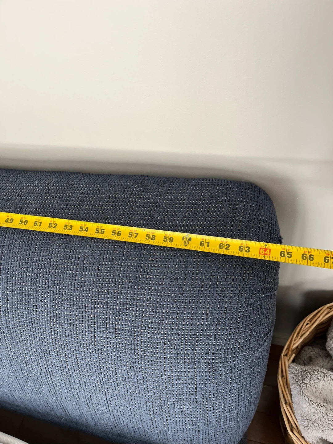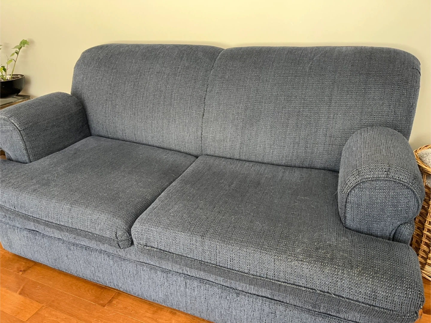 Blue fabric sofa that converts into a double bed. Mattress pad included. Dimensions approximately 55" wide by 30" deep when used as a sofa. Mattress measures roughly 50" wide. Originally from Lounsbury Fruniture.