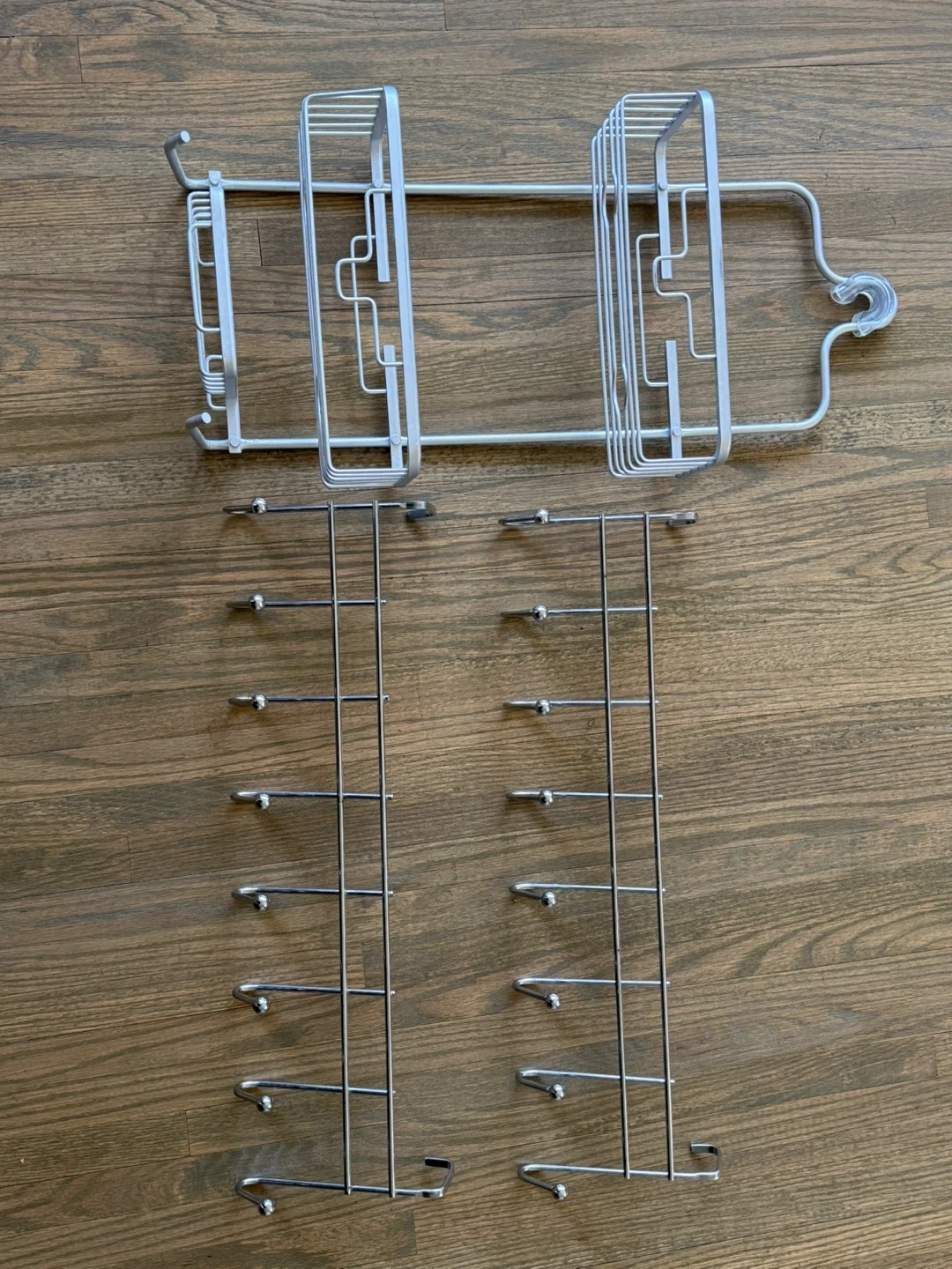 Silver tone metal shower caddy with two hanging baskets for storage. It comes with two detachable shelves that hook onto the main unit. Ideal for organizing toiletries in the shower!