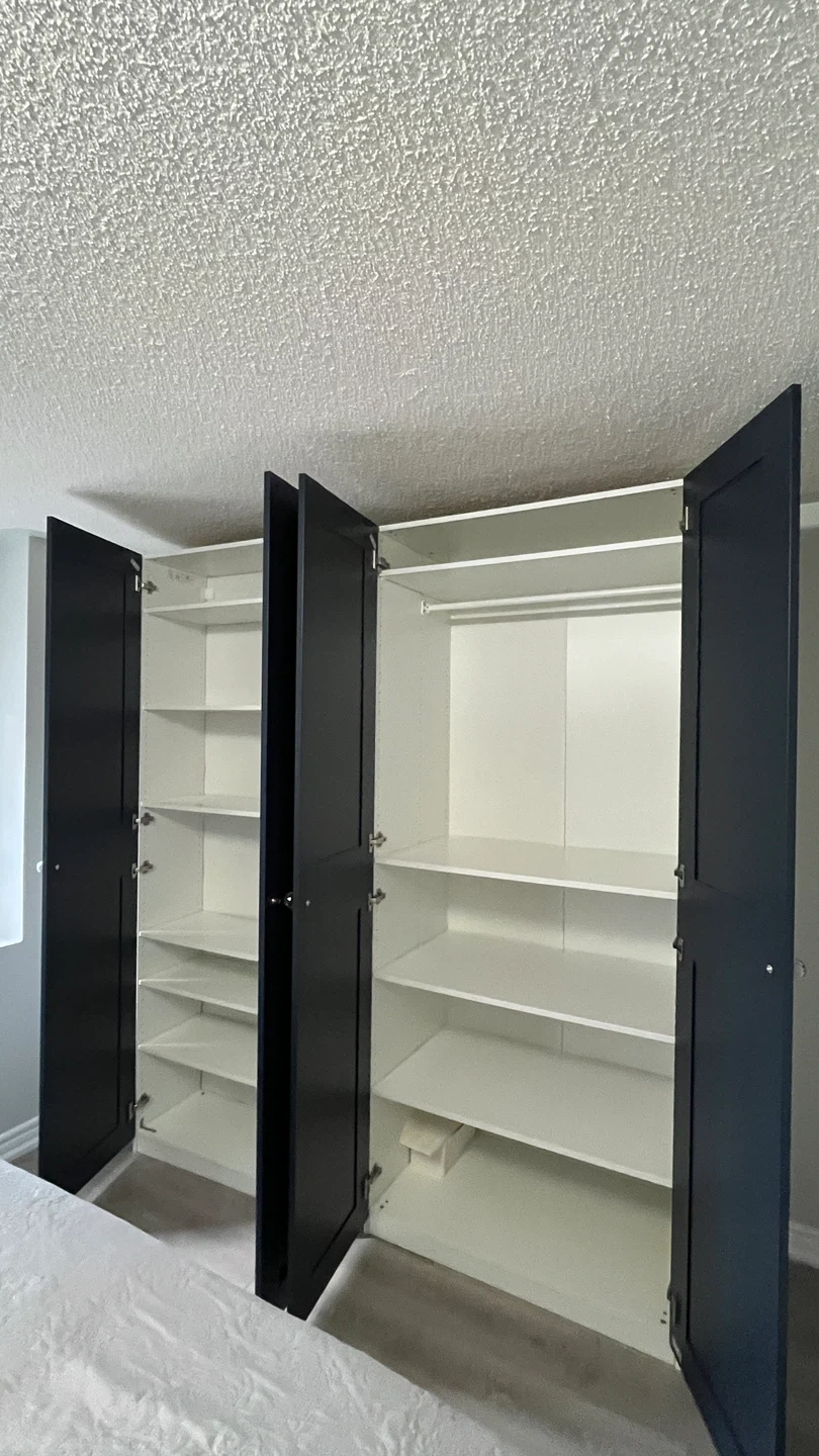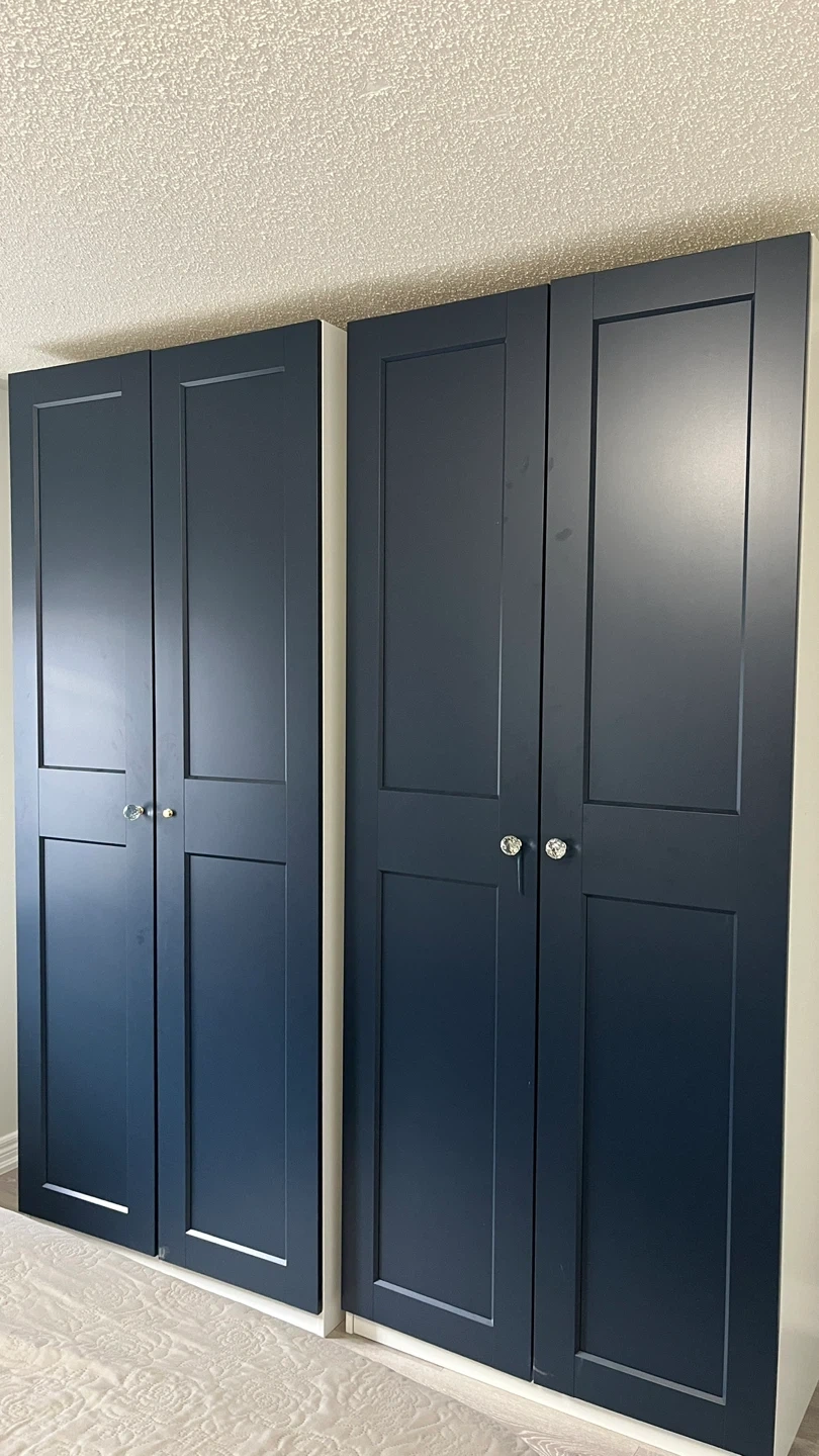2 dark blue wardrobe- 120$ each, perfect for a closet or storage unit. Includes closet rod and shelving inside. This set provides ample storage space for clothes and accessories.
