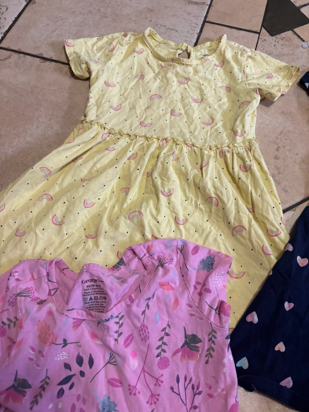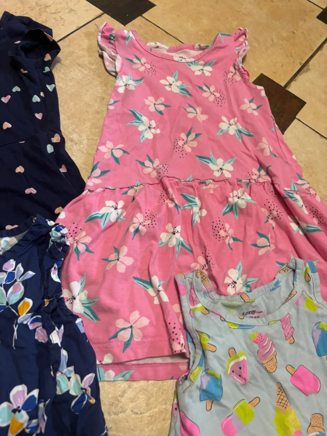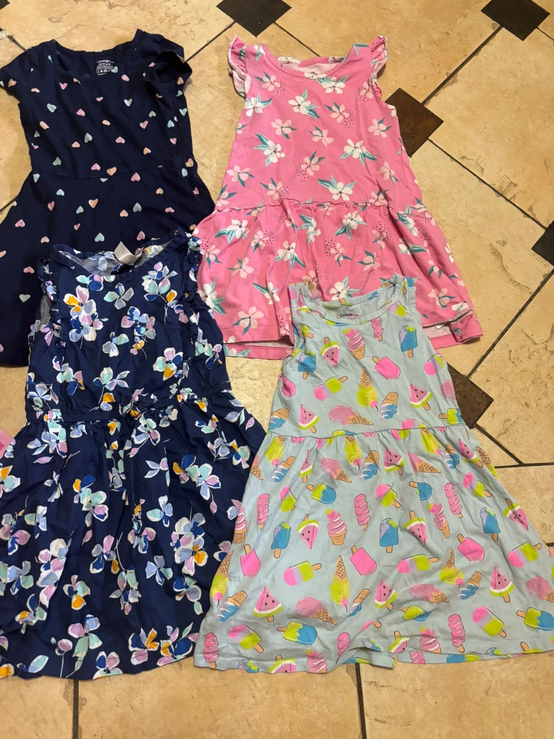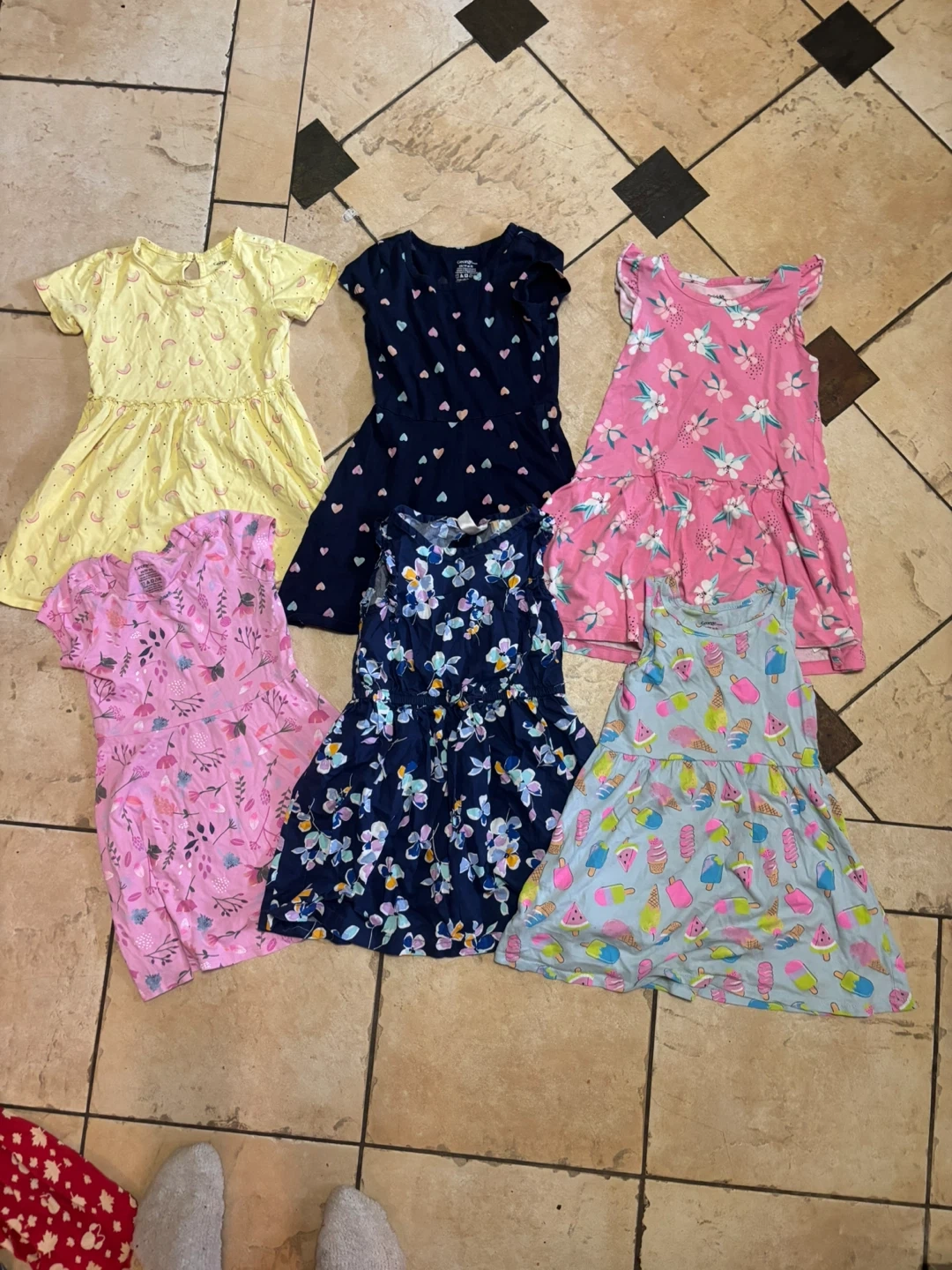 Six cute little dresses for a girl. Includes various patterns like hearts, flowers, rainbows, and ice cream treats. Perfect for warm weather fun!