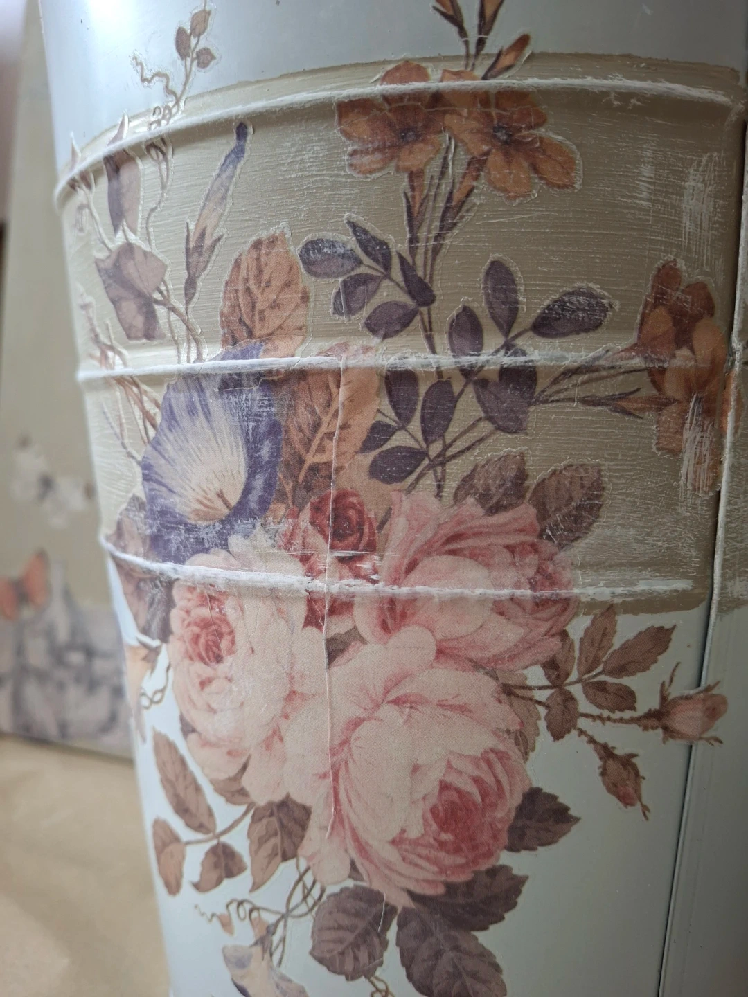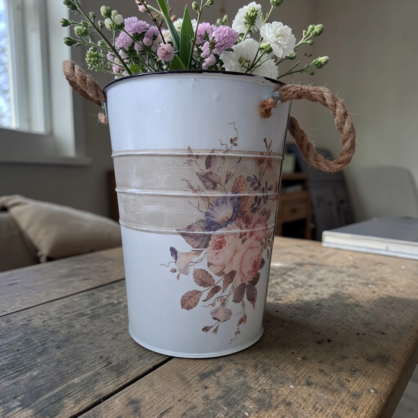 This decorative tin pail features a charming floral design with vintage-inspired accents. It has a rustic look with rope handles, perfect for holding flowers or as a stylish storage accent. The pail's design makes it a lovely addition to farmhouse or cottage decor. 9" high. Pickup near Lakeview Park in Oshawa.