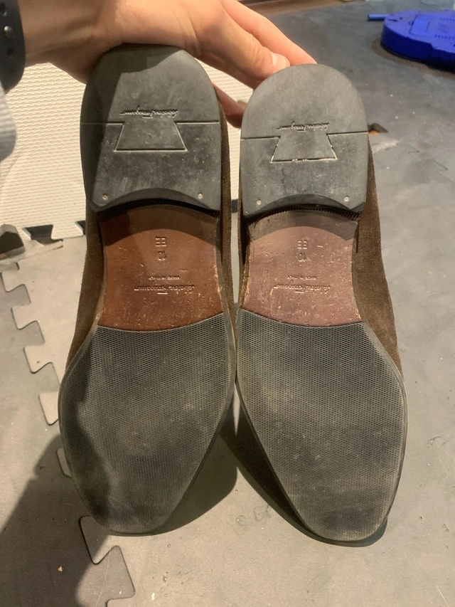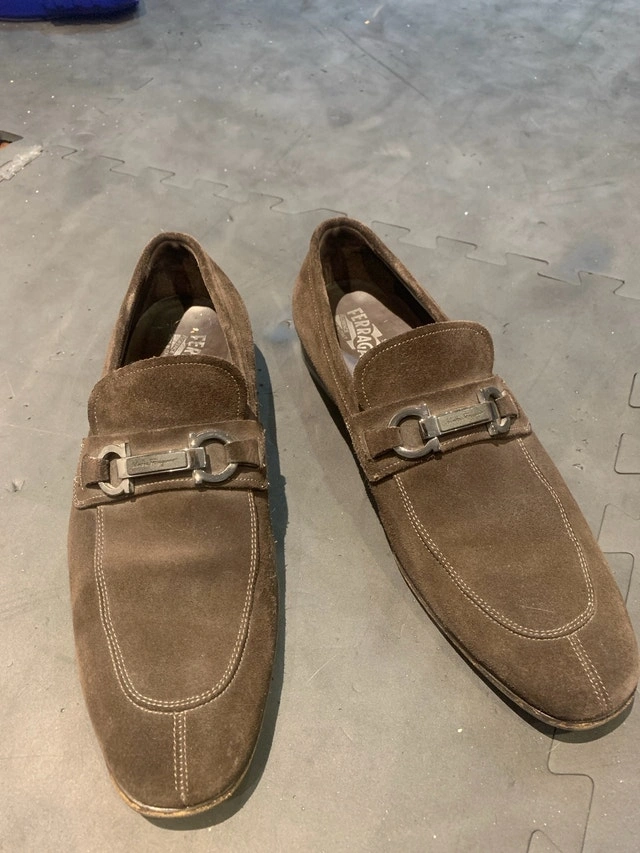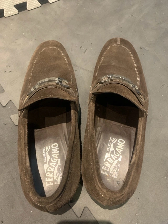 Real Salvatore Ferragamo loafers. Color is brown, and suede material is still brand new and barely used. Size says 10EE, fits like a size 11.