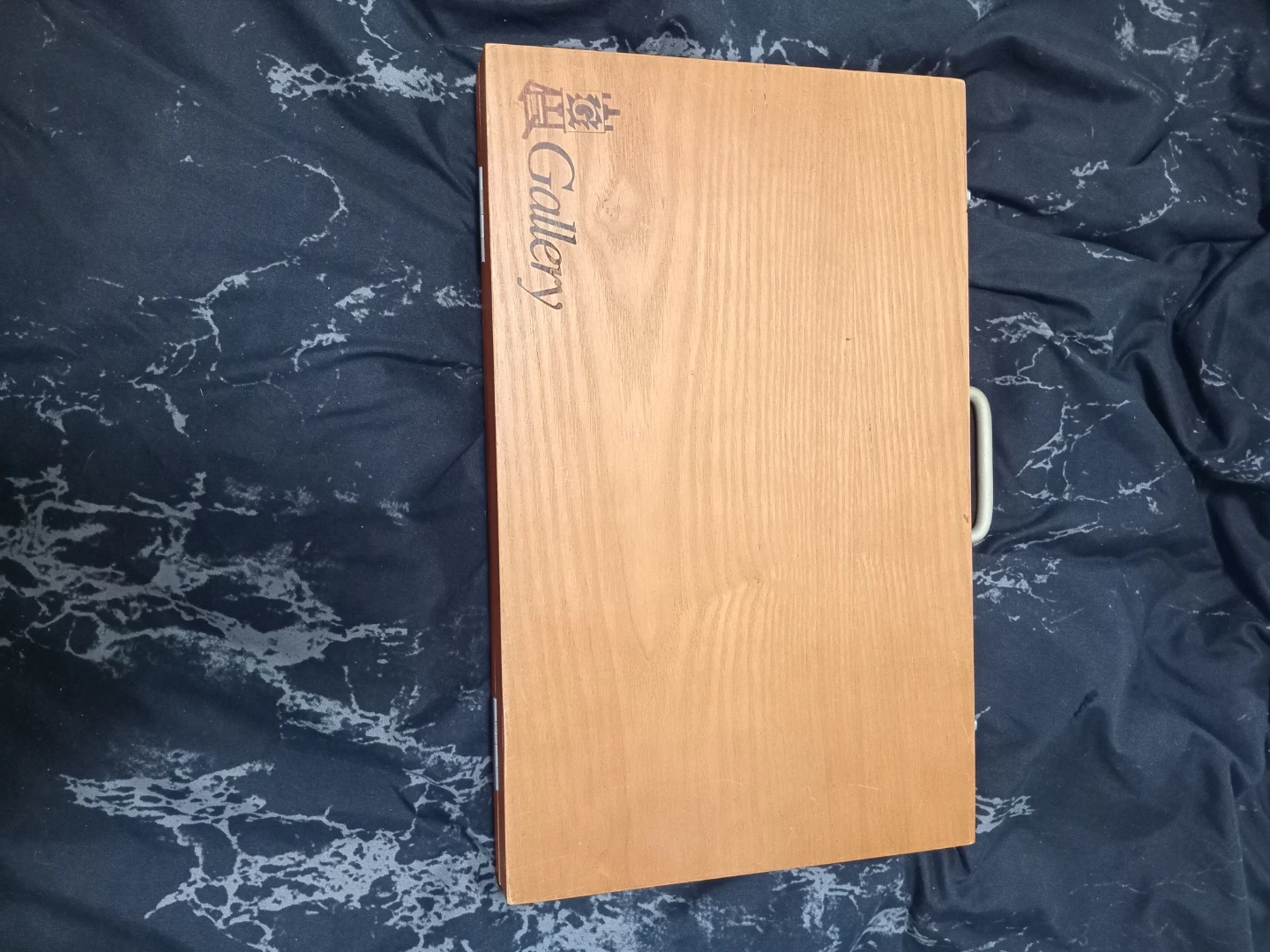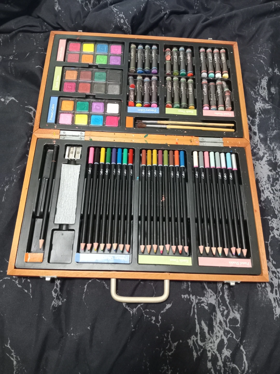 This is a wooden art case with a variety of art supplies. It's packed with colourful crayons, coloured pencils, pastels, watercolours, and brushes. It also includes a sharpener and eraser.