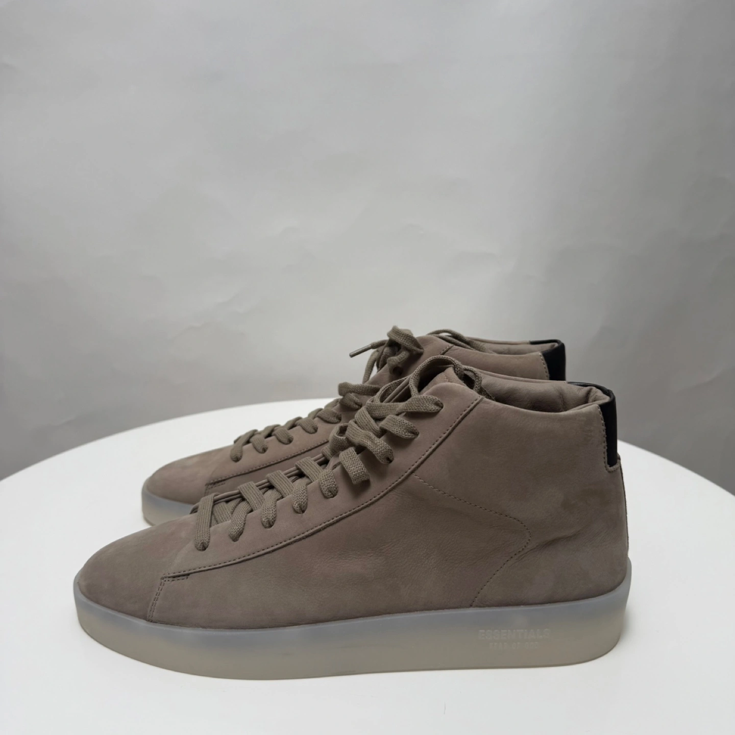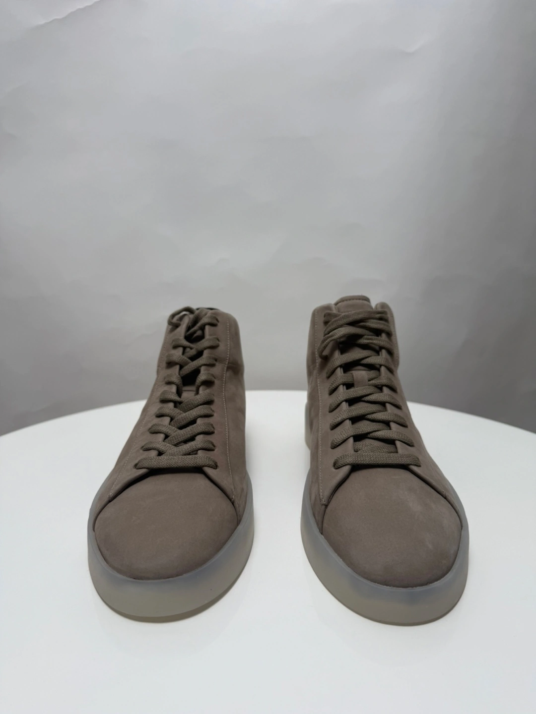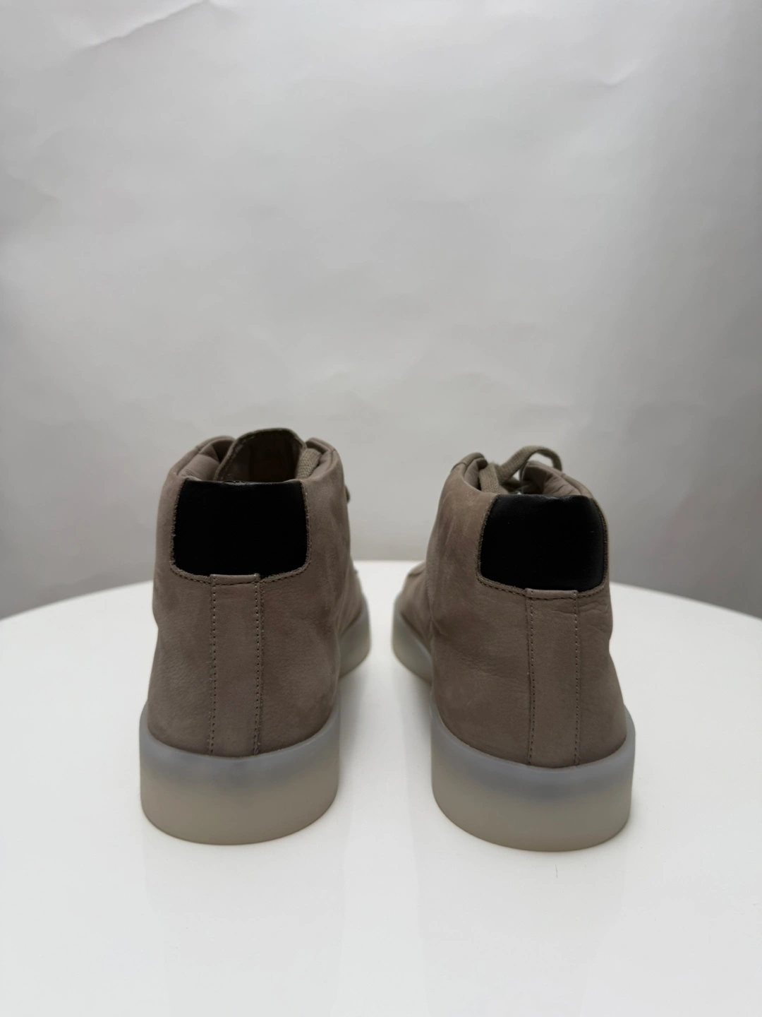 High-top nubuck sneakers in taupe. Logo embossed at outer side. - Lace-up closure - Padded collar - Pull-loop at buffed leather heel tab
