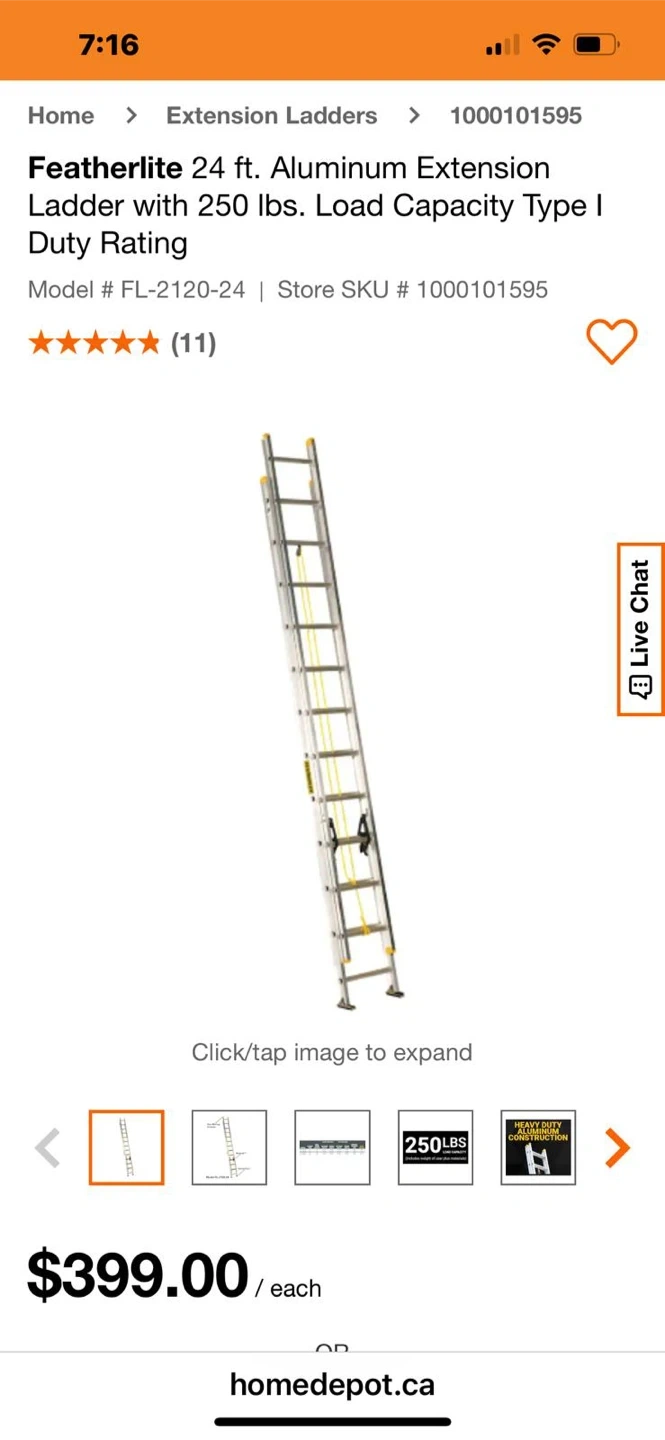 86Selling a Featherlite 24 ft. aluminum extension ladder with a 250 lbs load capacity. It's a Type I duty rating ladder. The model number is FL-2120-24. Retails for $399 at Home Depot