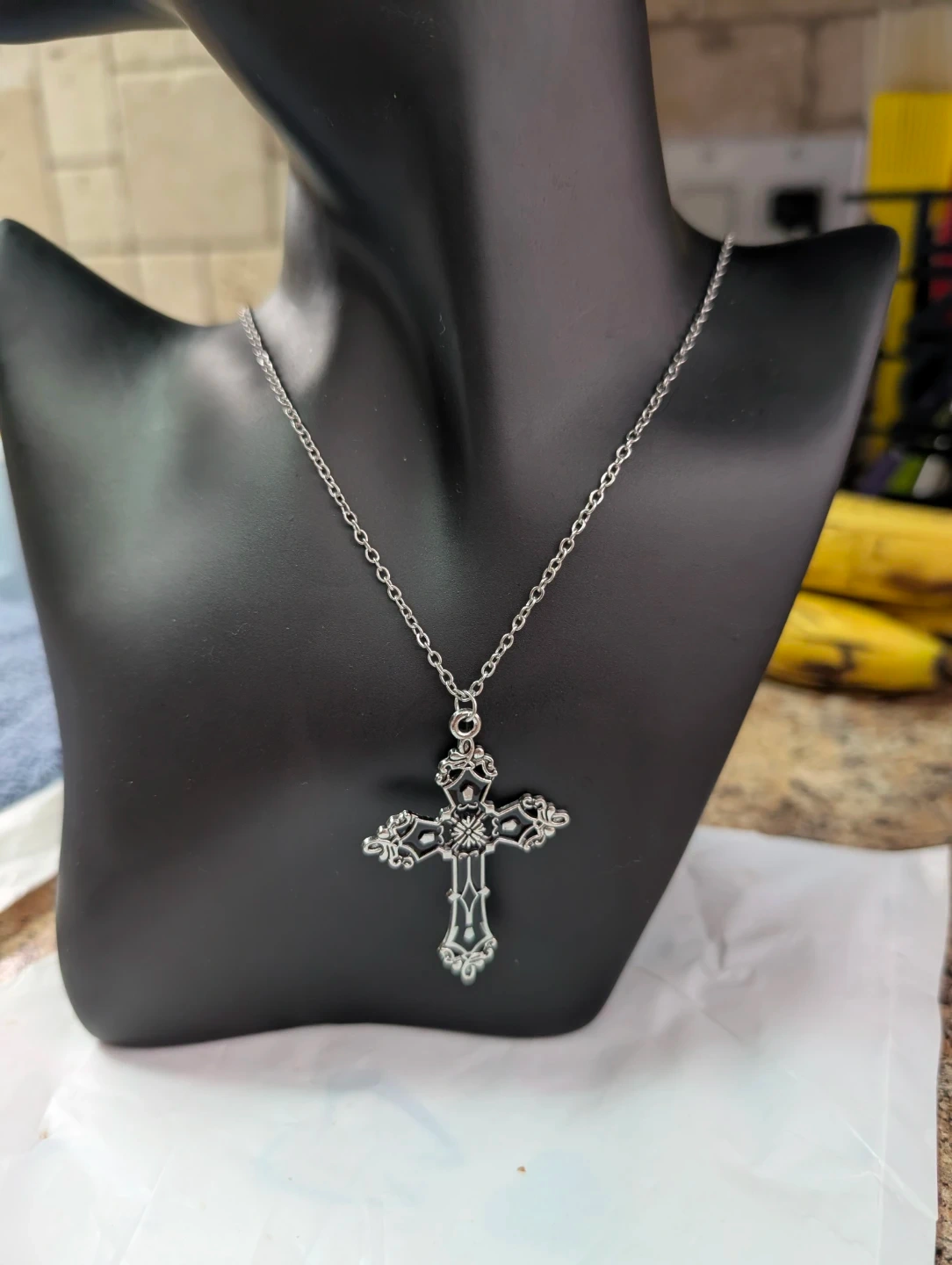 Gothic cross pendant necklace with an ornate, silver-tone finish. It features intricate scrollwork detailing and a black inlay for contrast. The chain is a standard link style. Perfect for adding a gothic or vintage touch to your outfit!