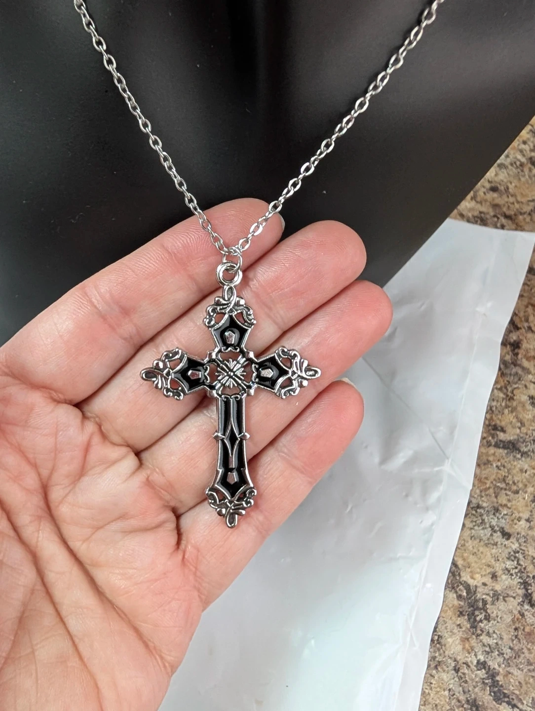 Gothic cross pendant necklace with an ornate, silver-tone finish. It features intricate scrollwork detailing and a black inlay for contrast. The chain is a standard link style. Perfect for adding a gothic or vintage touch to your outfit!
