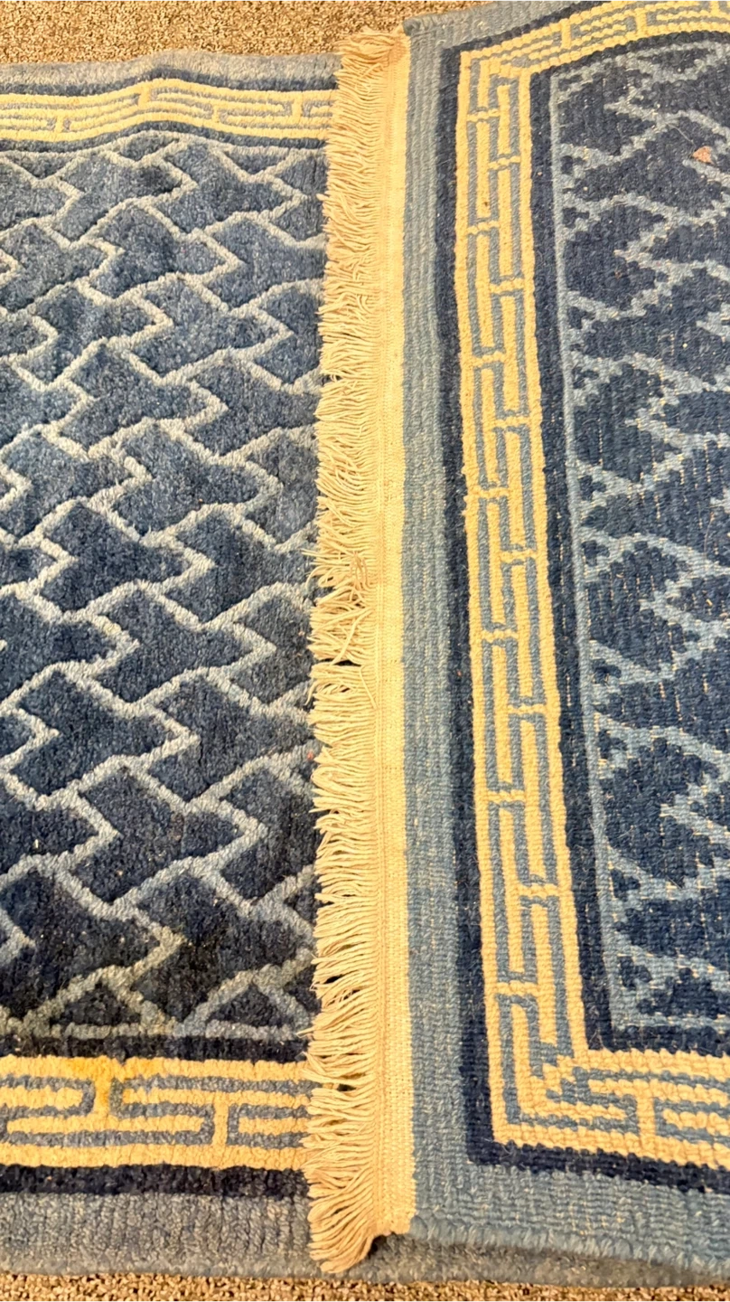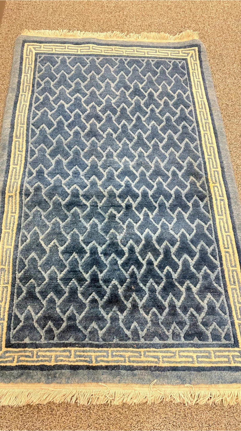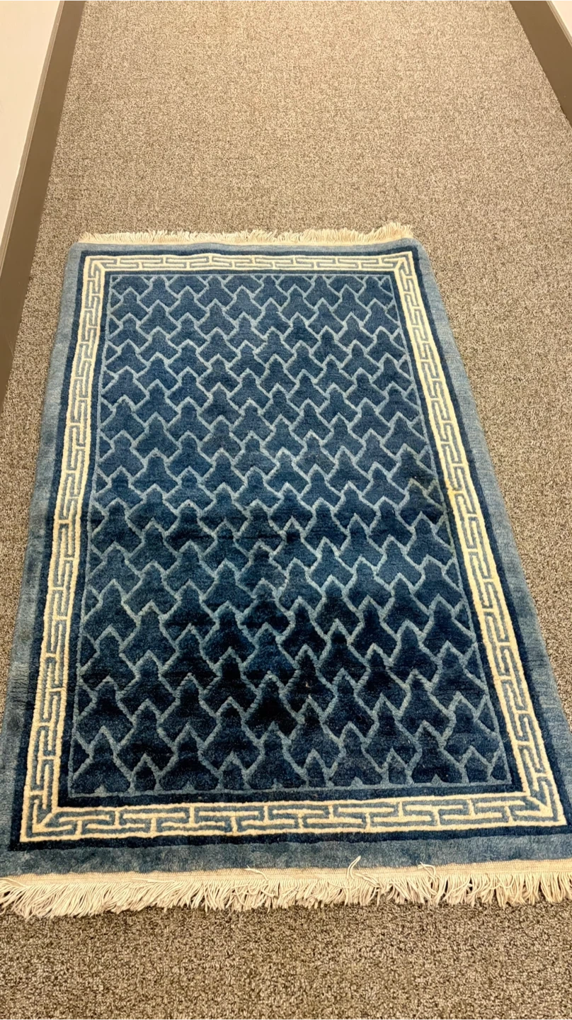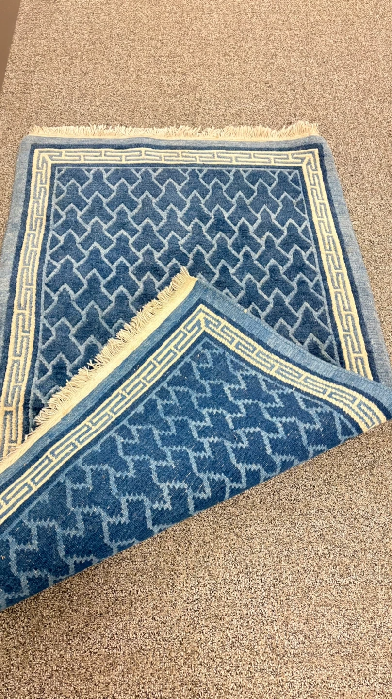 This rug features a striking blue geometric pattern with a cream border and fringe. It's a lovely accent piece for any room. Material appears to be wool or a wool blend.