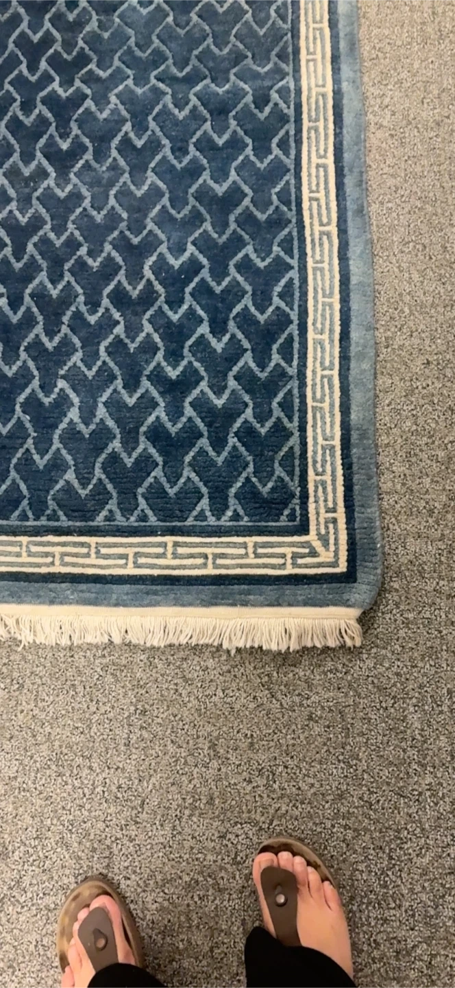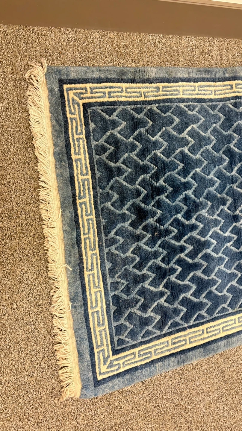 This rug features a striking blue geometric pattern with a cream border and fringe. It's a lovely accent piece for any room. Material appears to be wool or a wool blend.