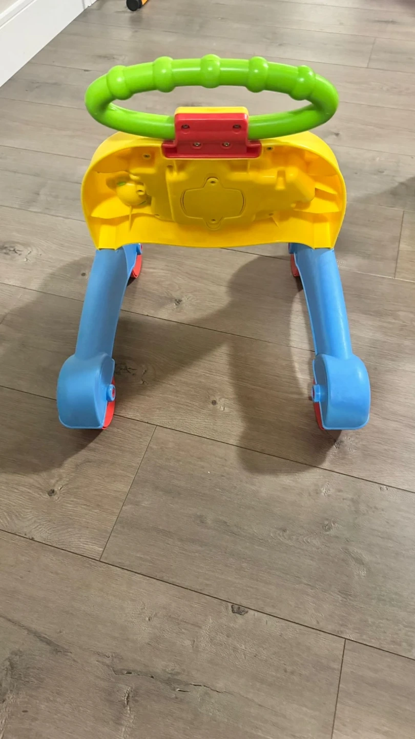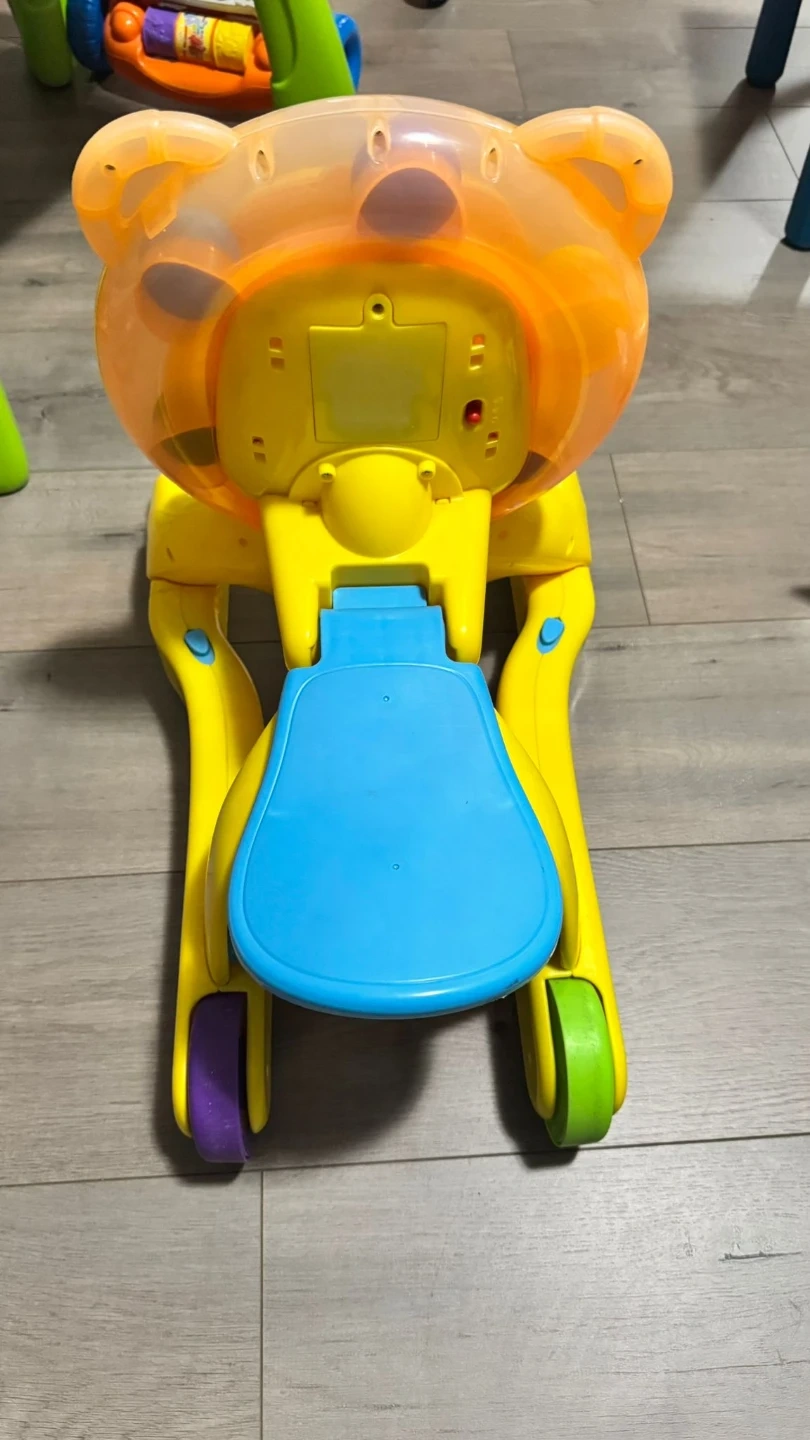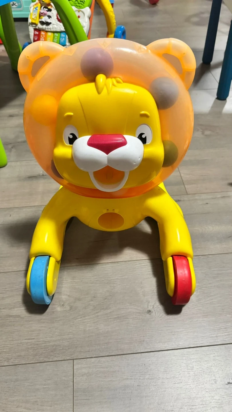 Yellow and orange baby walker shaped like a lion. It has a green handlebar and blue legs with red, blue, green, and purple wheels. This walker helps little ones learn to walk. It's suitable for babies just starting to stand and take steps.
