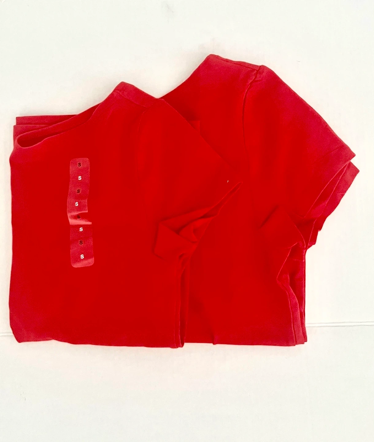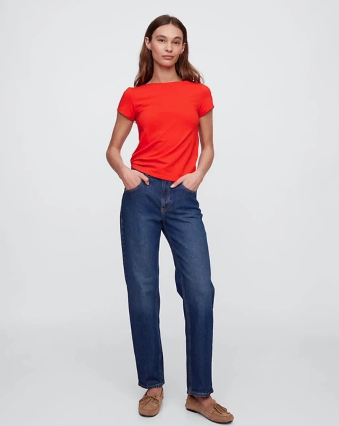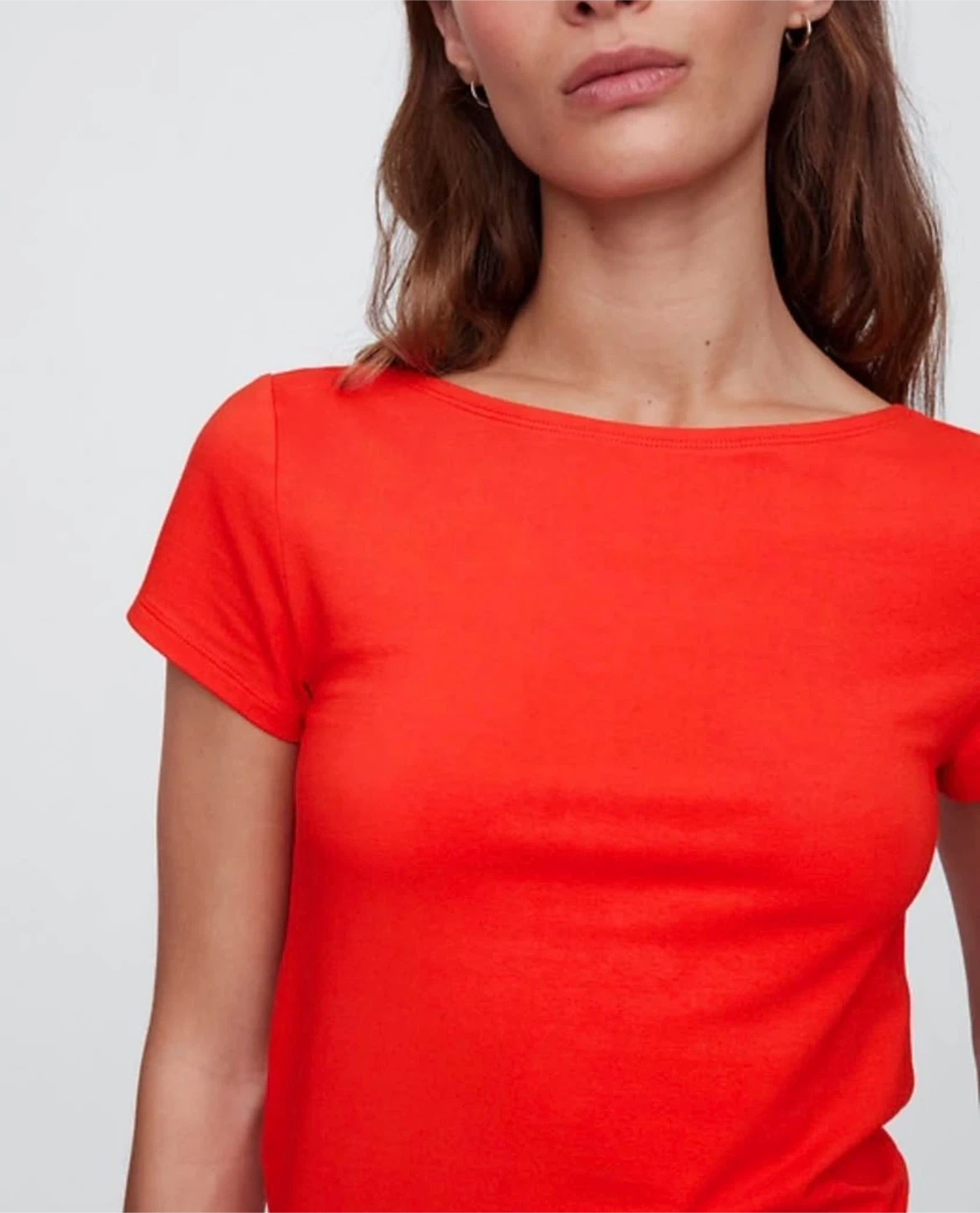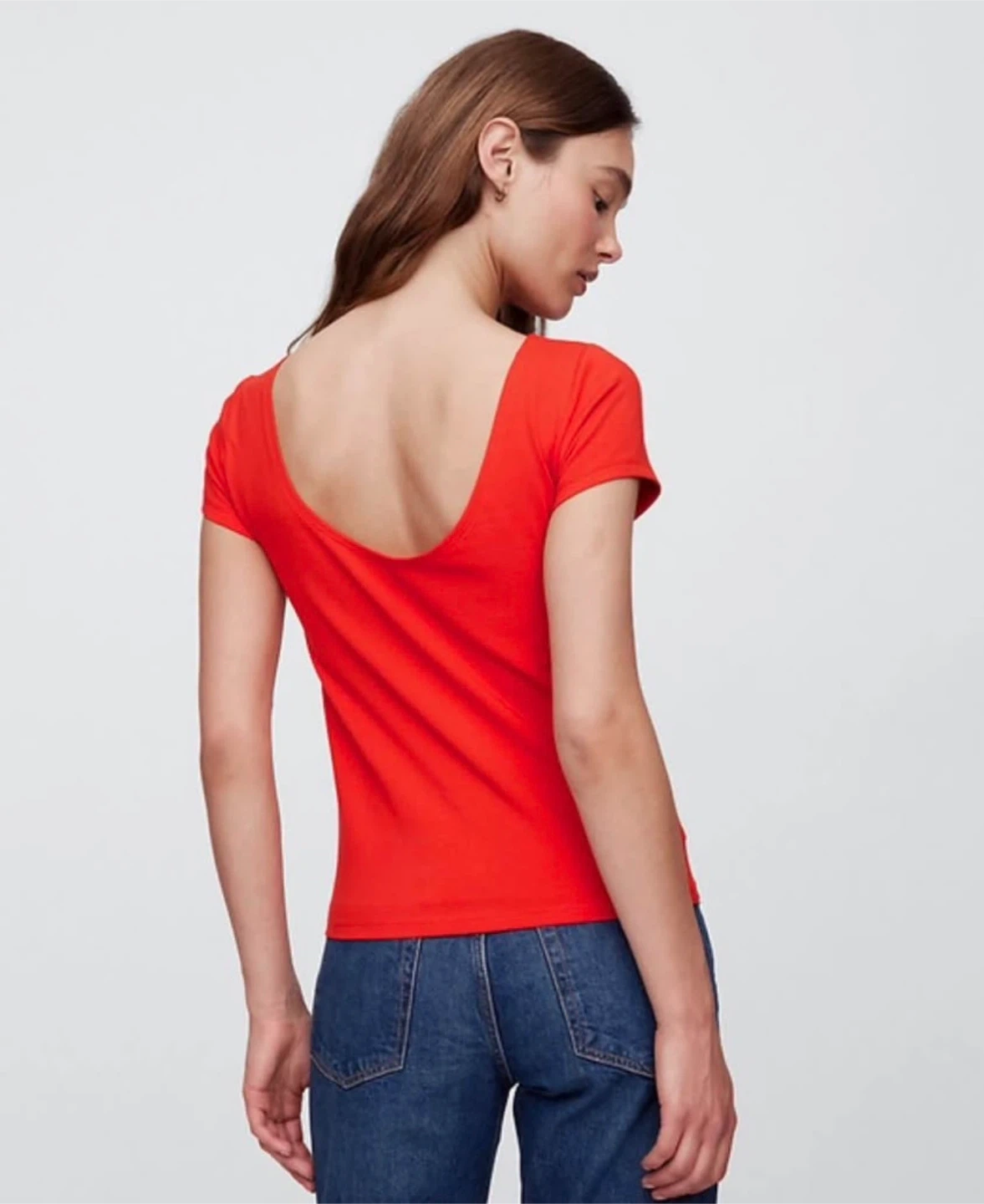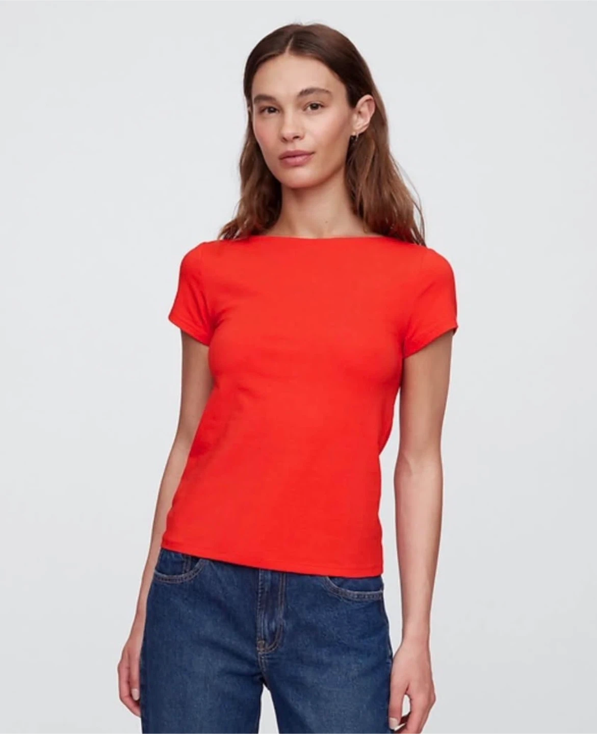 Chic and minimal with a statement back. This bright red boatneck T-shirt features a flattering open-back scoop design and a soft, fitted silhouette. Easy to dress up or down, perfect with jeans, skirts, or layered under a blazer.
