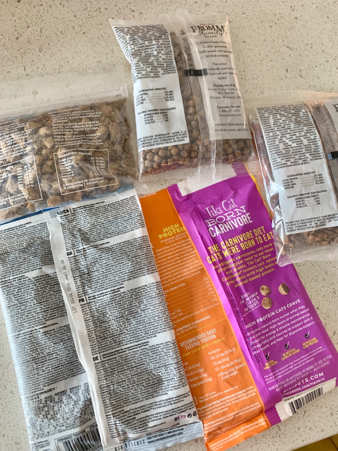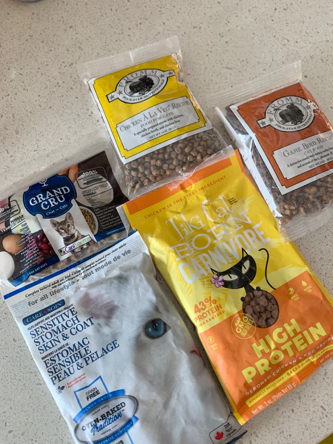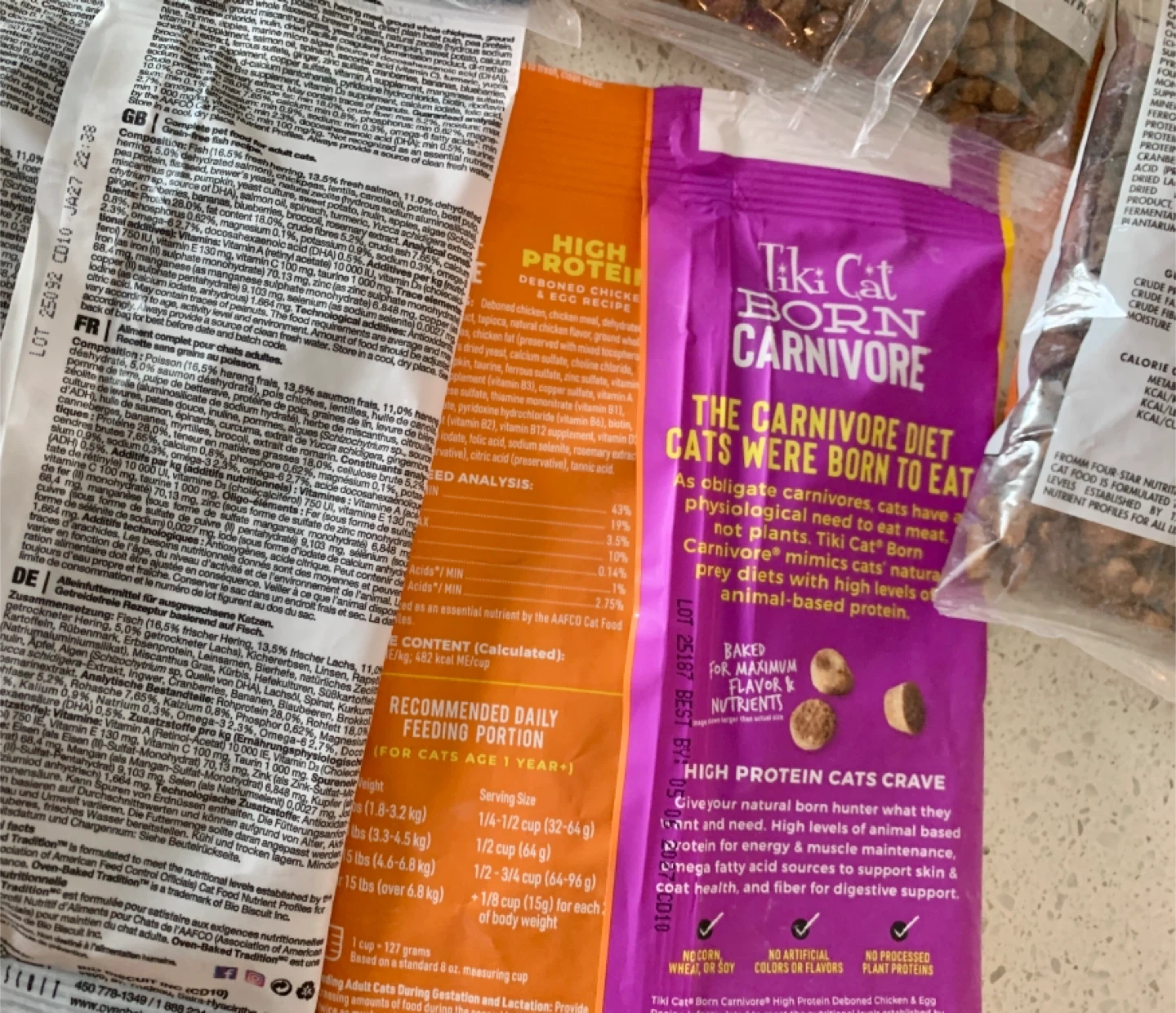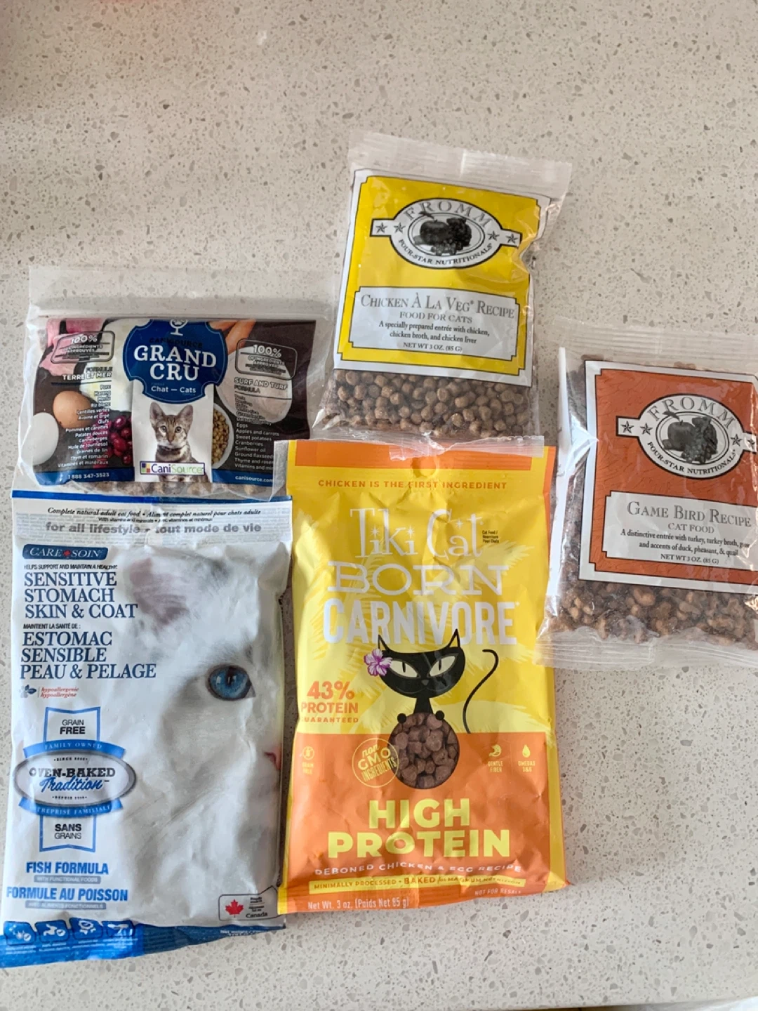 This is a variety pack of premium cat food. It includes Tiki Cat Born Carnivore High Protein Dehydrated Chicken & Egg Recipe and Fromm Family Pet Foods in Chicken a la Veg and Game Bird recipes. Also included is a bag of Grand Cru by Pure Vita for cats. Nutritional information is available on packaging.