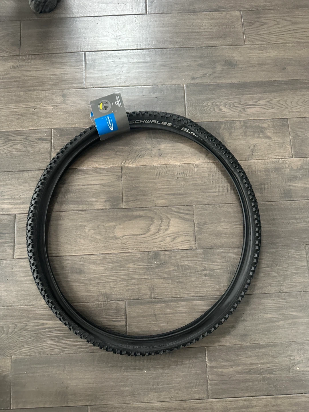 Schwalbe Black Jack bicycle tire. It's black with a knobby tread for off-road use.