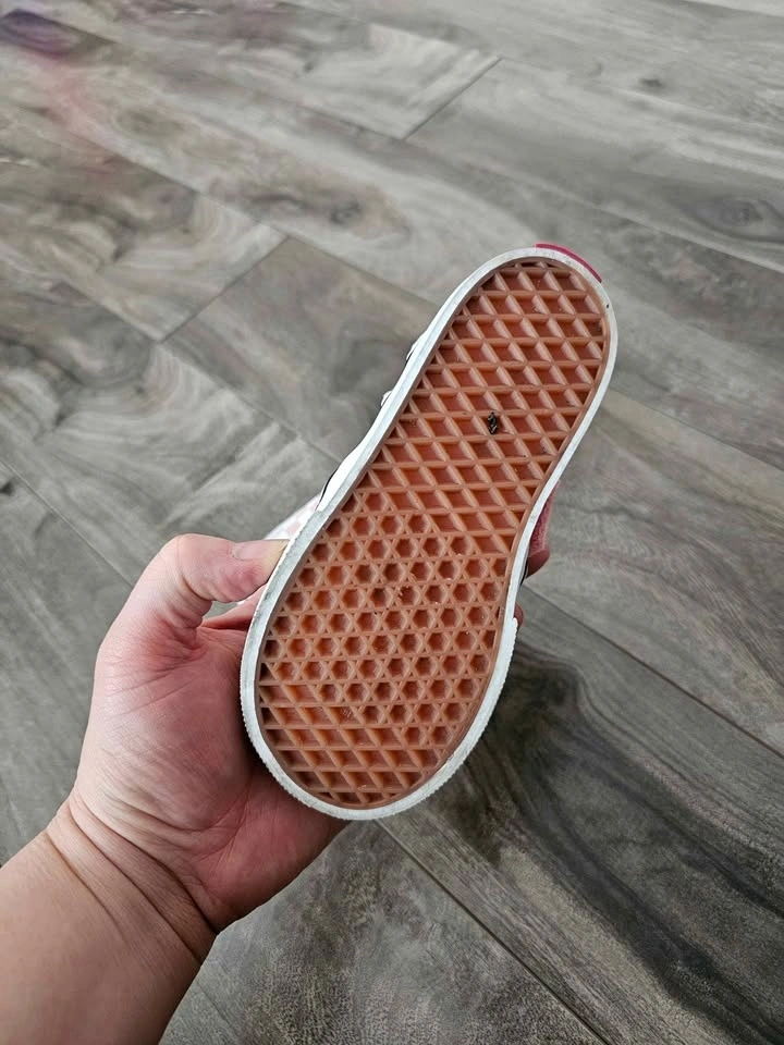 Cute Vans slip-on shoes with a pink and white checkered pattern. Easy to slide on and off. Soles are clean and have good tread.