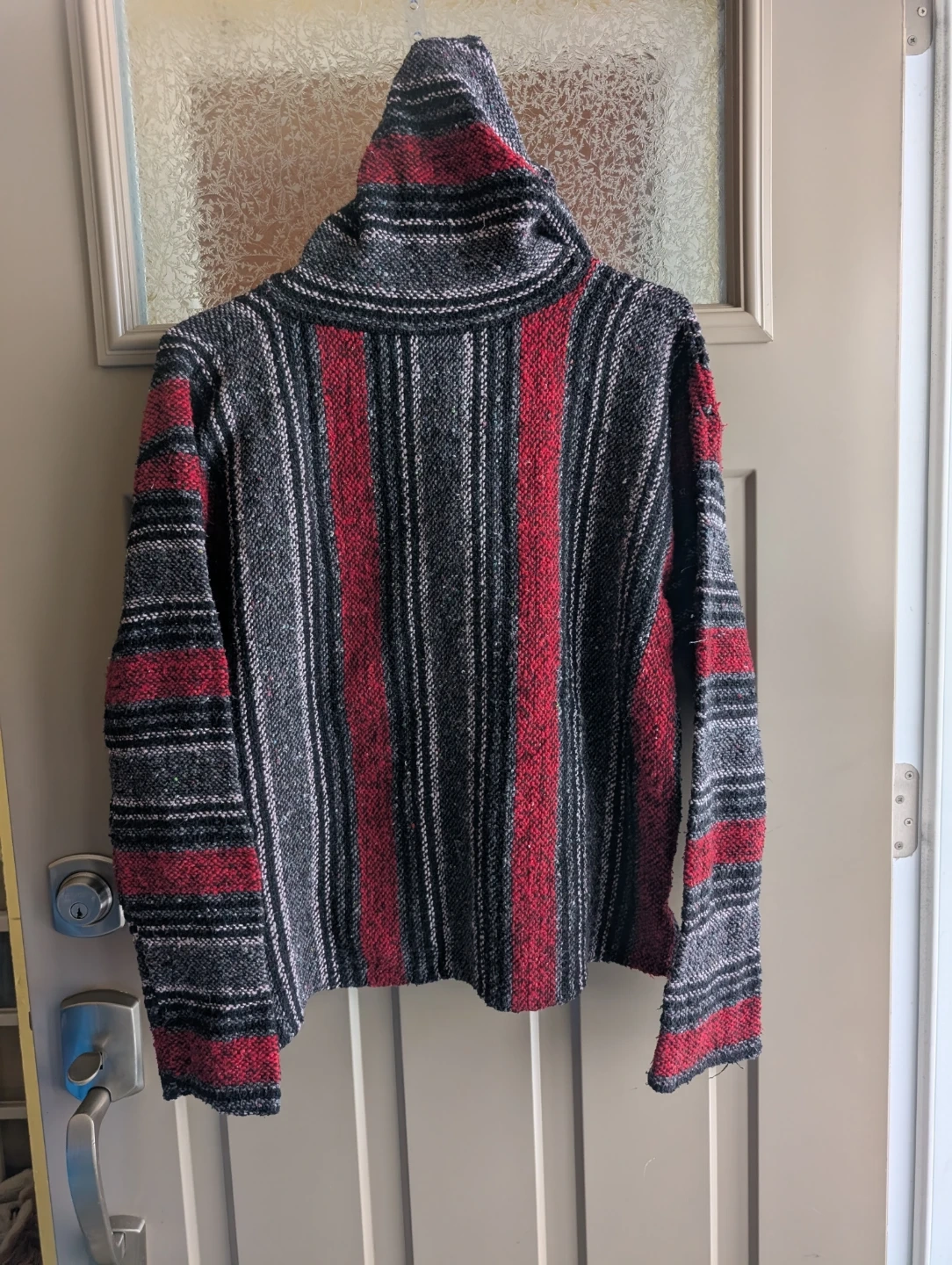 Men's size XL, Oland brand, Mexican Baja hoodie. Red, black and grey coarse woolen jerga fabric. Kangaroo front pocket. Some minor pilling but otherwise good condition