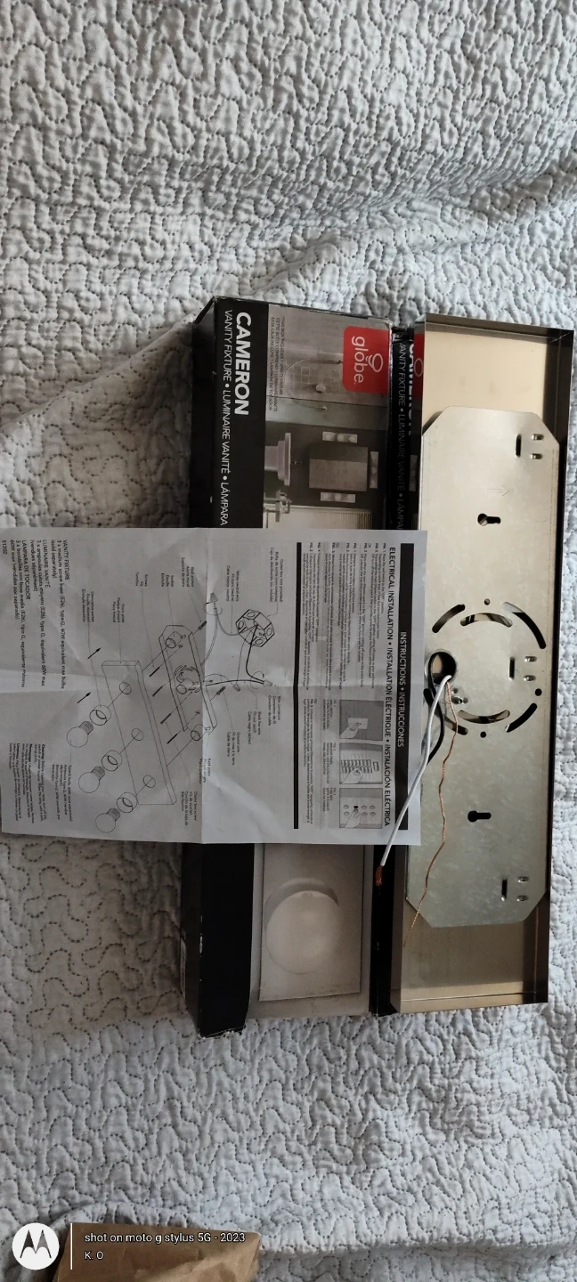 This is a Globe Cameron vanity fixture. It's a three-light fixture with a brushed nickel finish. Includes installation hardware and instructions.