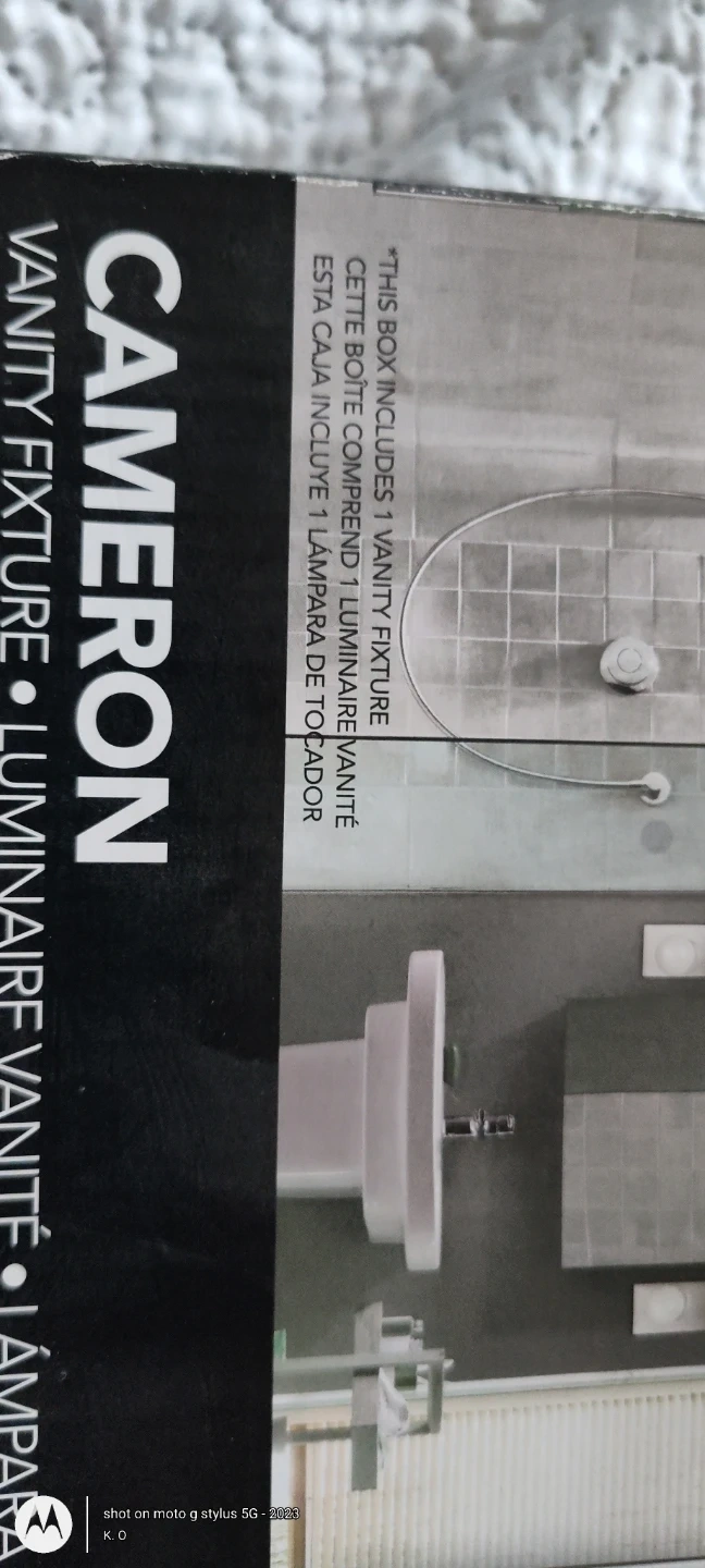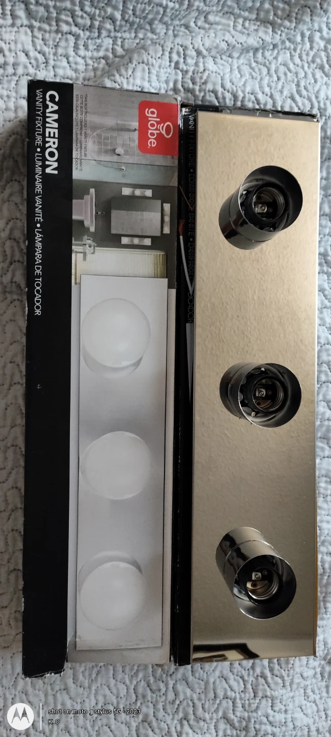 This is a Globe Cameron vanity fixture. It's a three-light fixture with a brushed nickel finish. Includes installation hardware and instructions.