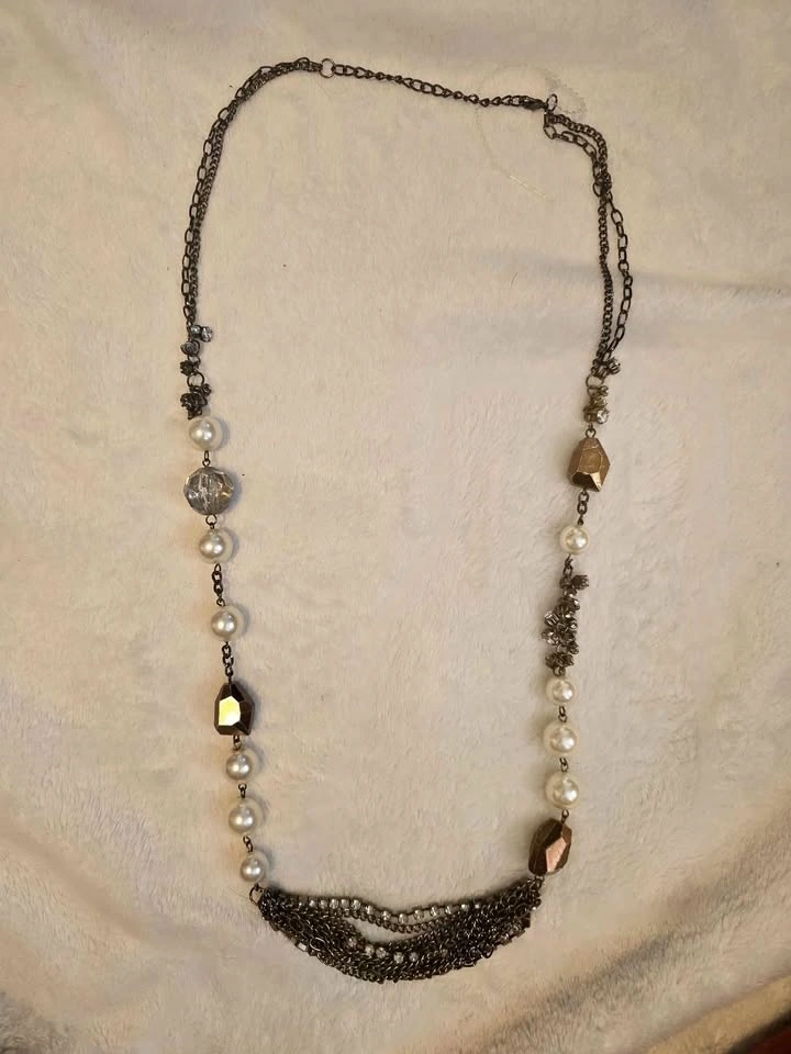 3 ft long undone. Has very cute pearles and large abstract beads with clusters of sparkly gems! It's a beautiful vintage accent piece.