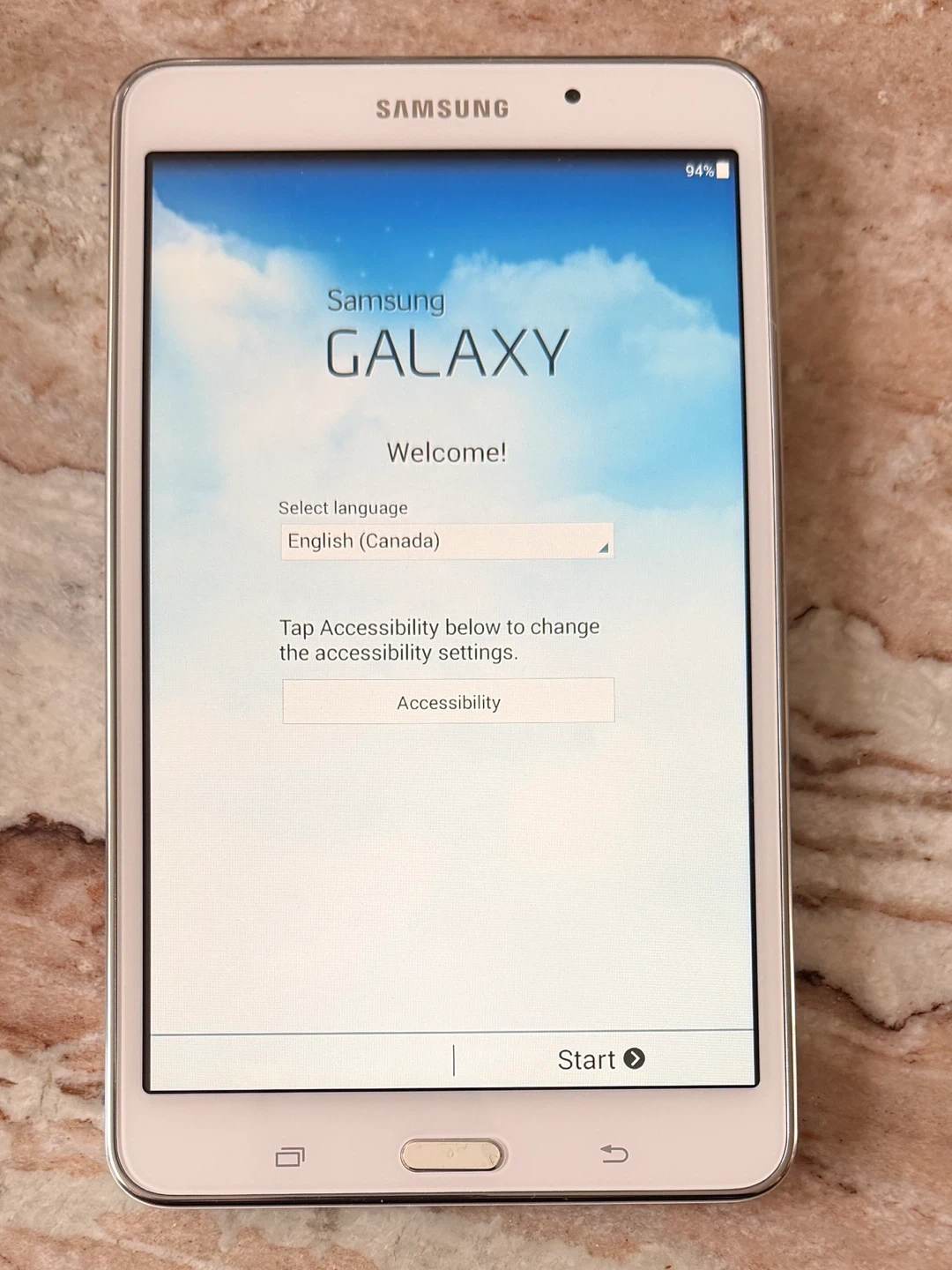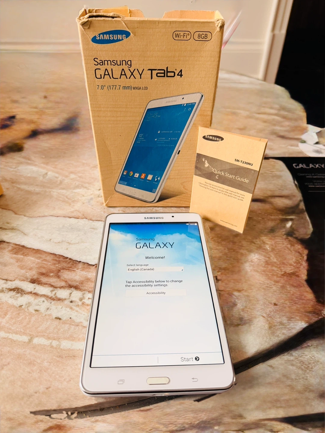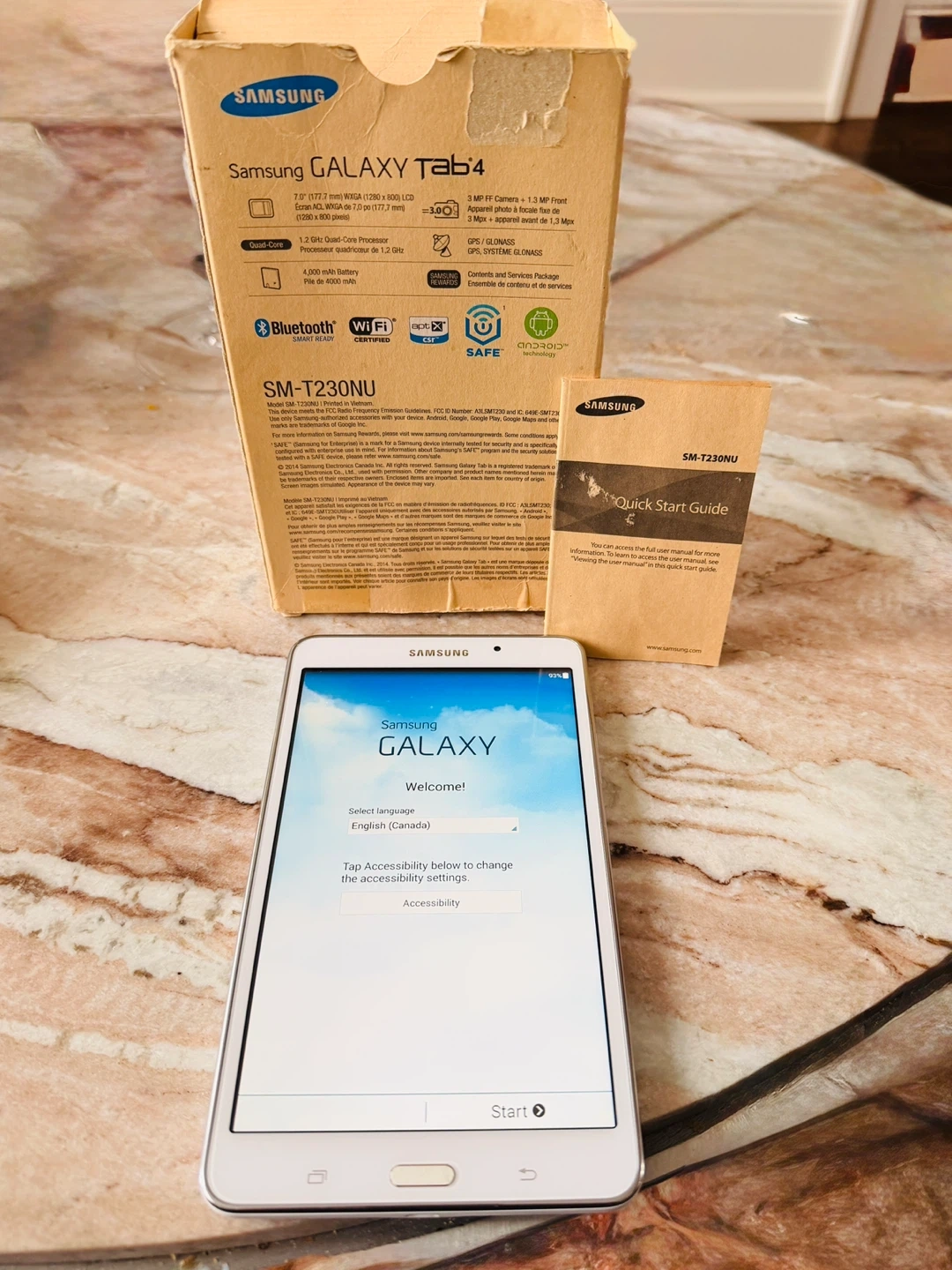 It comes with its original box in decent condition as seen in photos, Samsung charger & cord and a quick start guide. The tablet is powered by Android.