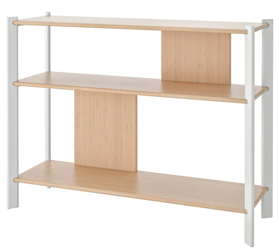 Three-shelf storage unit. White metal frame. Light wood shelves. Excellent condition. Minimalist, clean design. Perfect for living room, tv rack or home office.