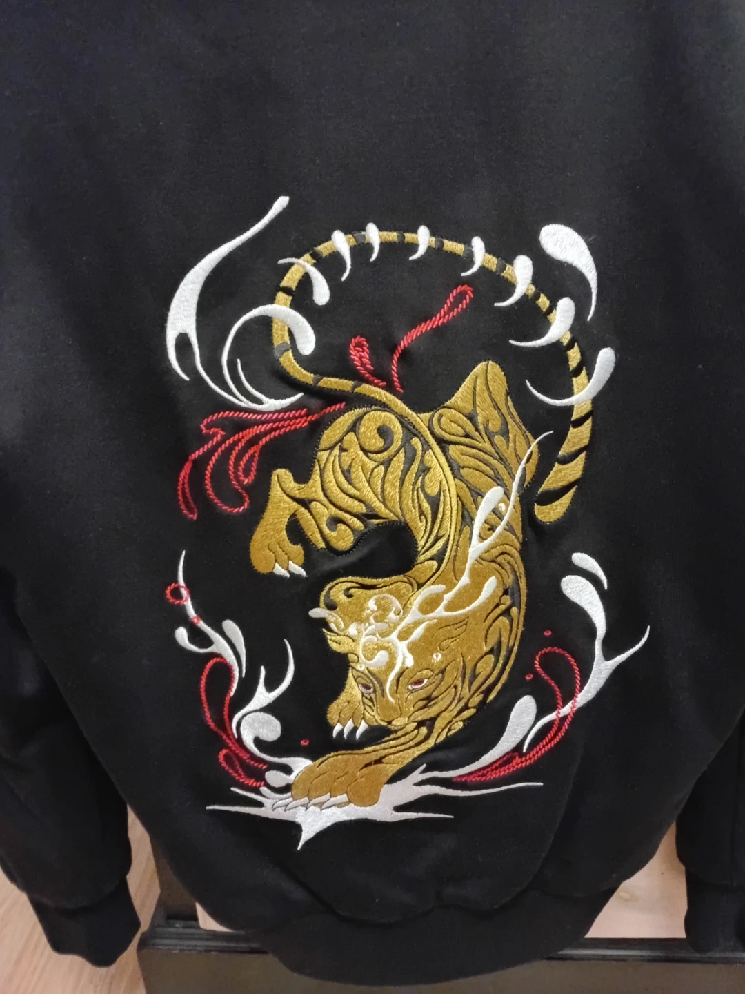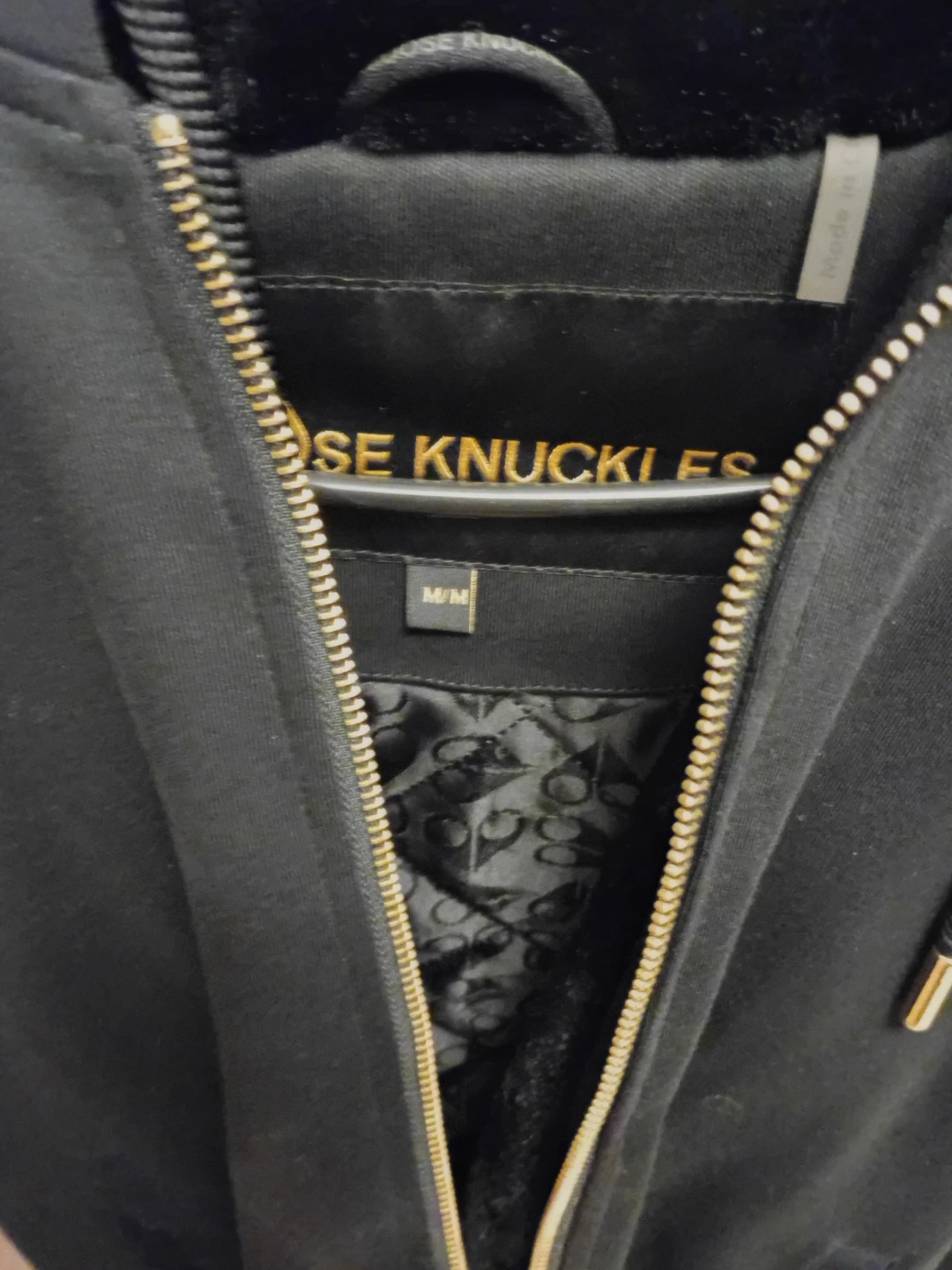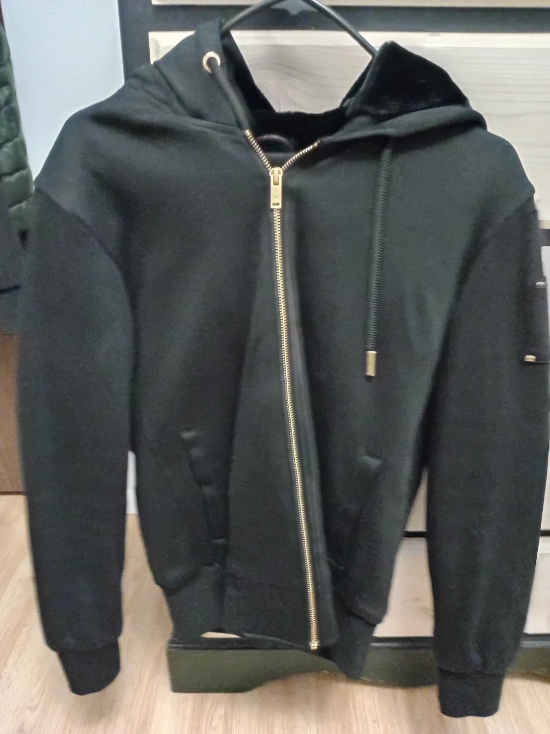 Selling a Moose Knuckles hoodie in black, size medium. It features a gold zipper and a cool tiger design on the back. Great for staying warm and stylish!