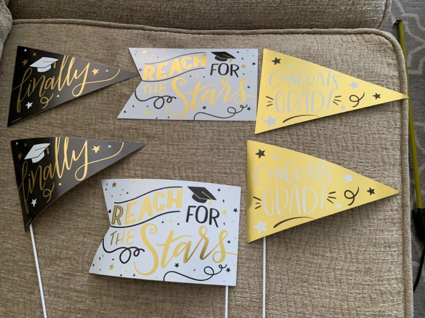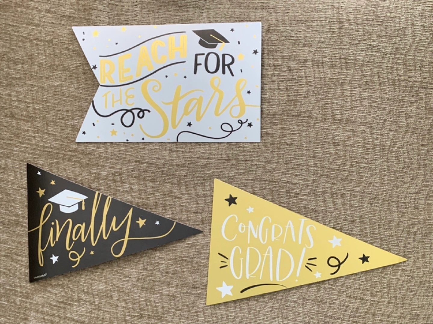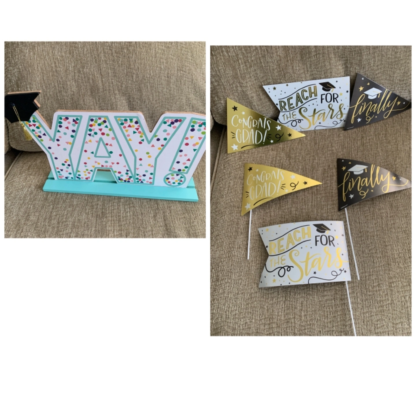 A graduation-themed set. Contains several pennant flags and a wooden cutout decoration. Would be perfect to celebrate a milestone.