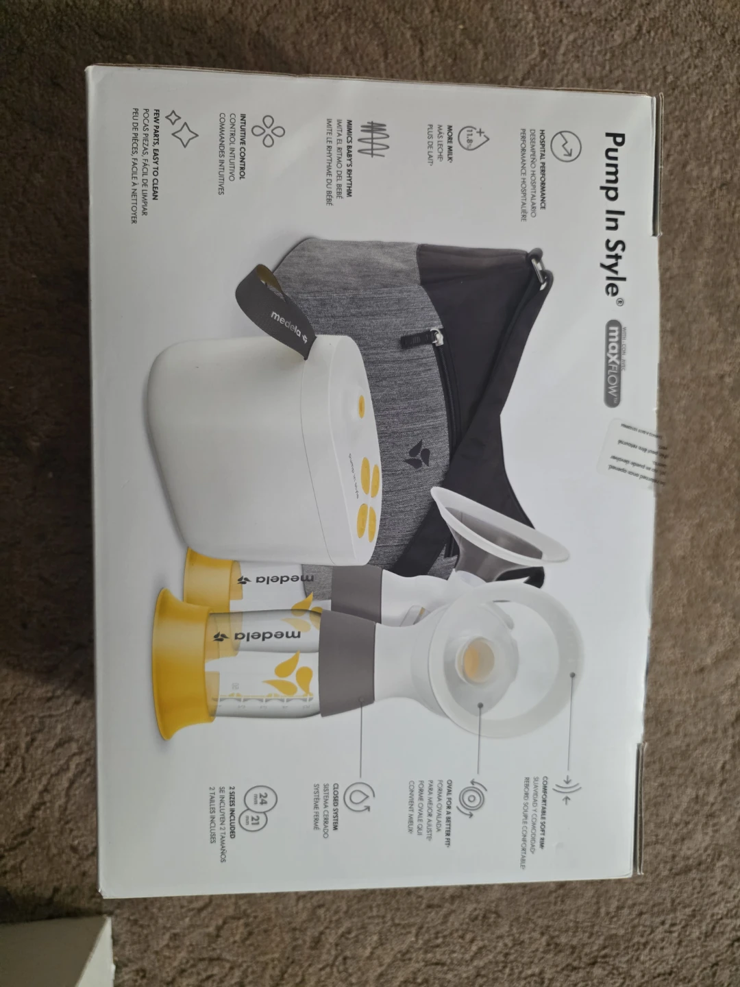 This is a Medela Pump In Style MaxFlow double electric breast pump. It includes a portable bag and two bottles. The pump is designed for hospital performance and comfortable use.