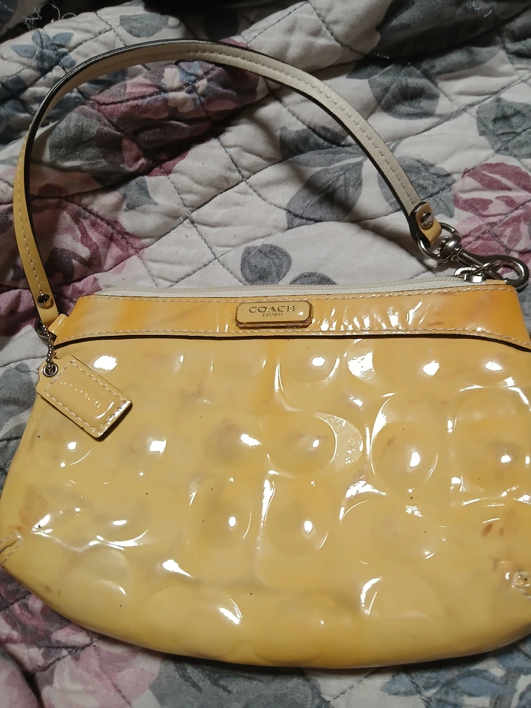 This Coach wristlet is a vibrant yellow patent leather. It's a compact size, perfect for carrying essentials. The interior is lined in a bright teal colour. Price is firm plz. Pick up midland and Danforth 401 bay street or stc mall