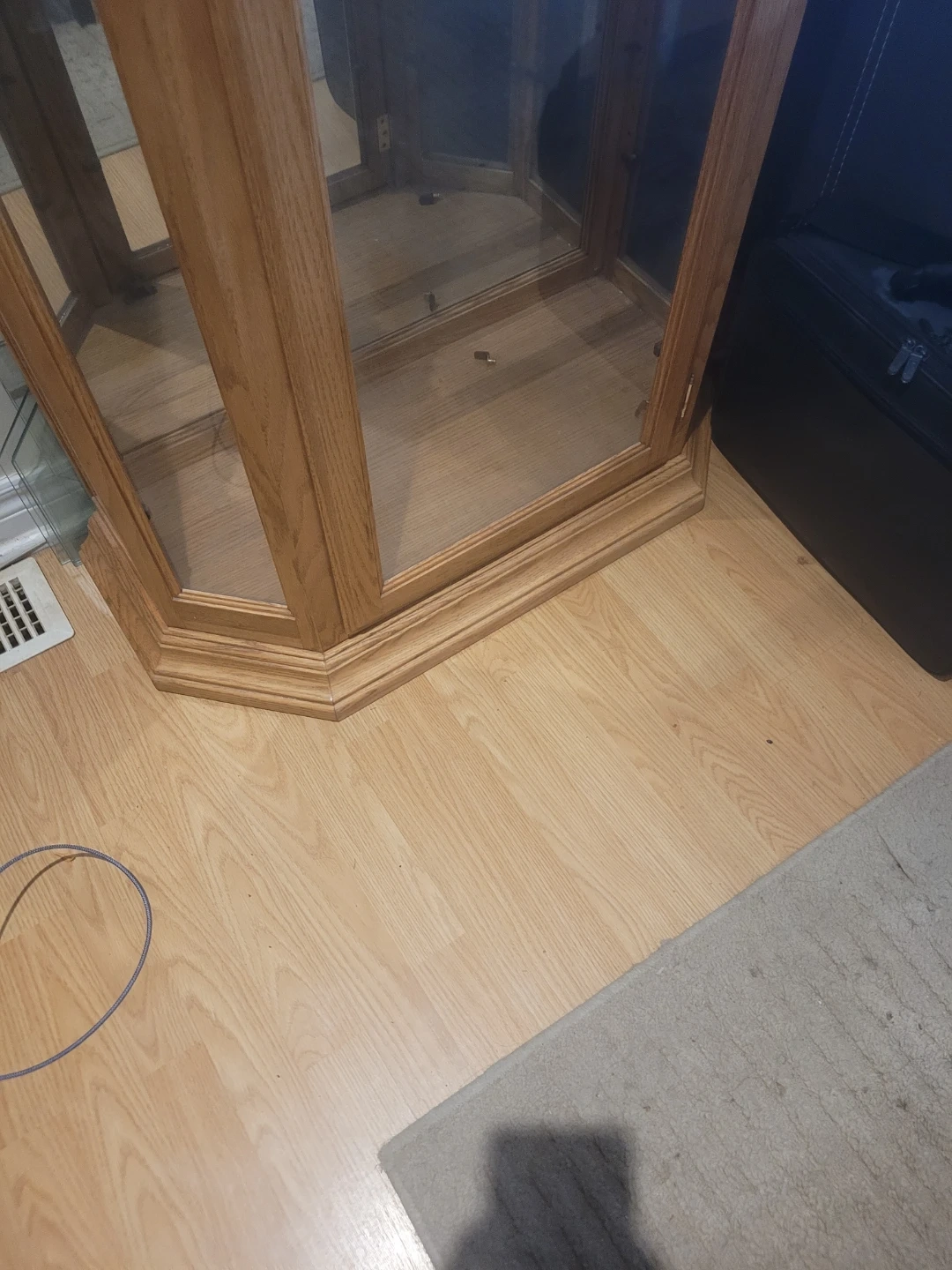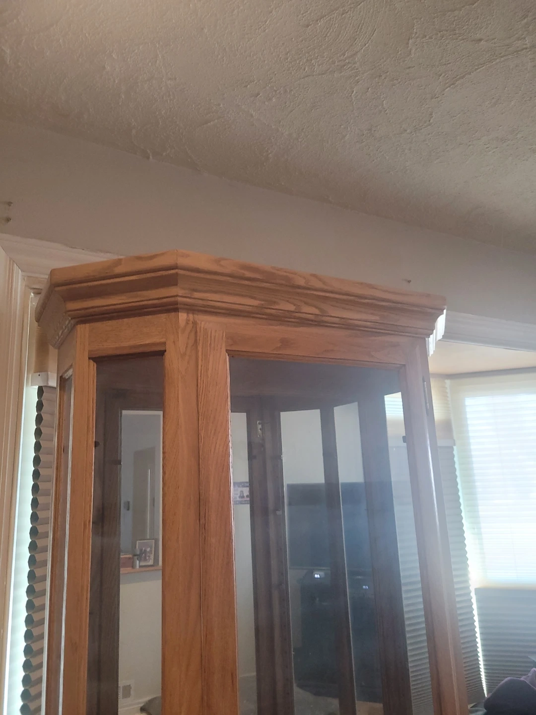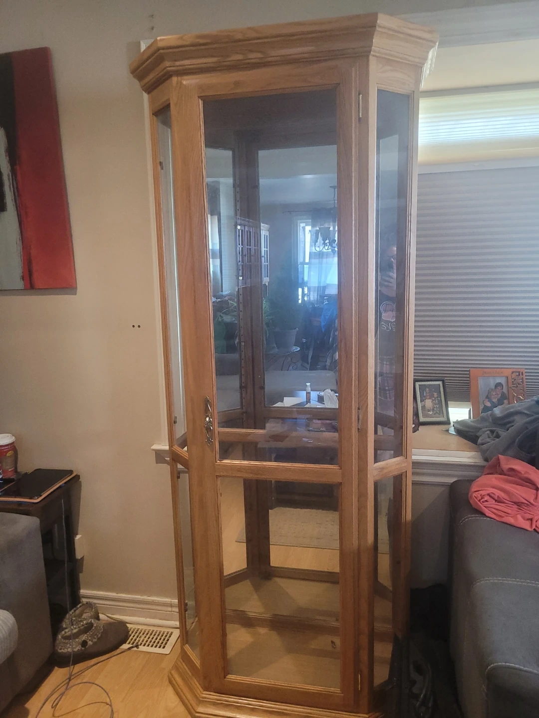 This is a lovely oak wood curio cabinet, perfect for displaying your collectibles. It features glass doors and sides for a clear view of your items. Has 4 glass adjuatable ahelves.This cabinet would be great for showcasing decorative pieces in your living room or dining area.