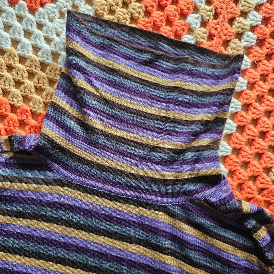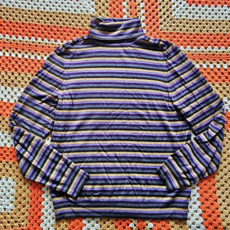 Stylish and warm early 2000s Y2K era 100% merino wool slim fit knit turtleneck sweater from Club Monaco. Made of fine gauge and lightweight but substantial soft merino yarn. Sweater has horizontal stripes in deep plum purple, a lighter lavender purple, mustard yellow, and charcoal grey. A perfect closet staple for layering or wearing on its own.