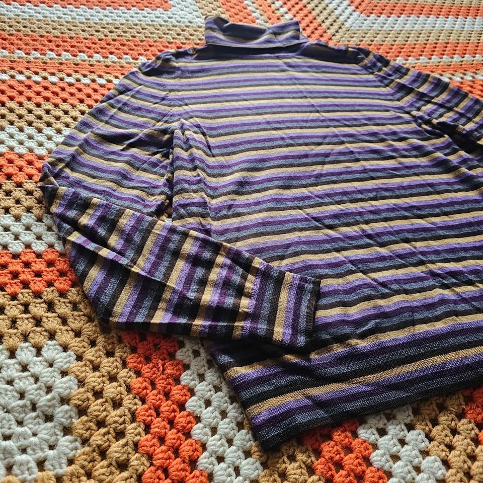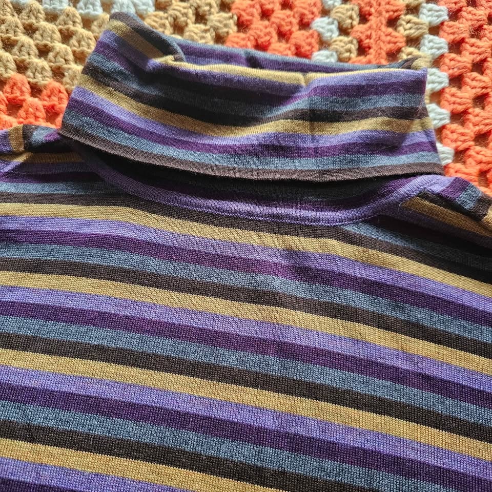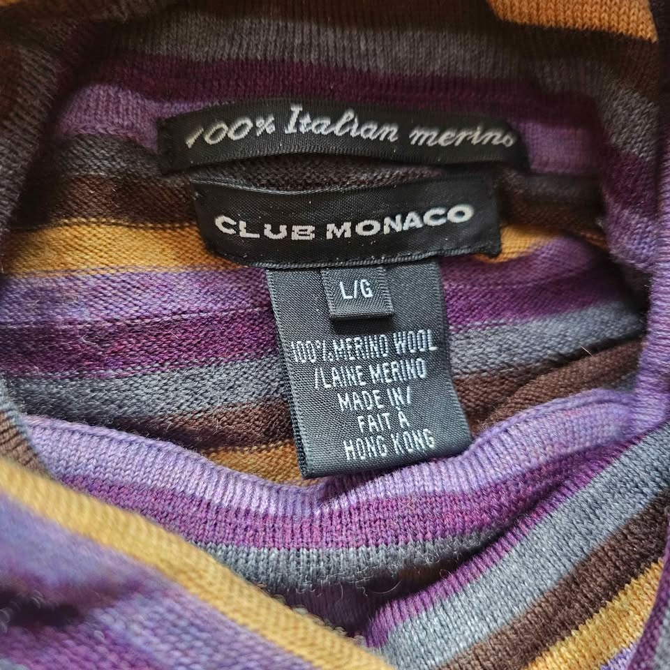 Stylish and warm early 2000s Y2K era 100% merino wool slim fit knit turtleneck sweater from Club Monaco. Made of fine gauge and lightweight but substantial soft merino yarn. Sweater has horizontal stripes in deep plum purple, a lighter lavender purple, mustard yellow, and charcoal grey. A perfect closet staple for layering or wearing on its own.