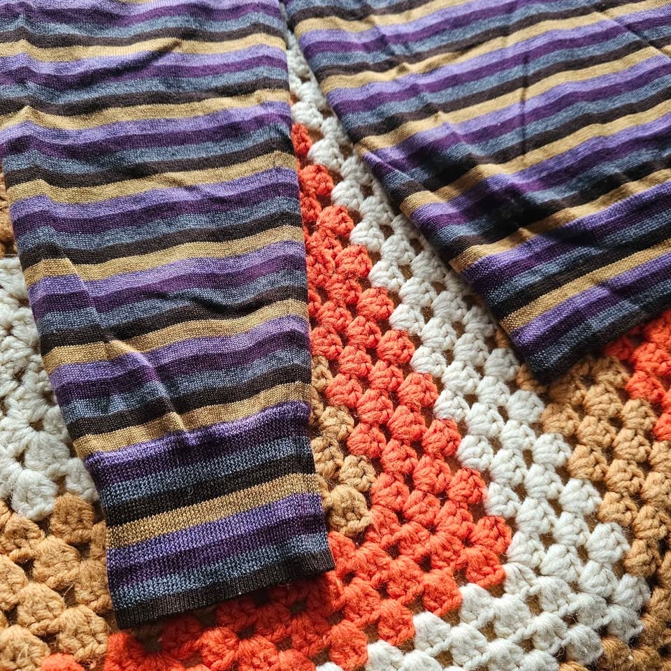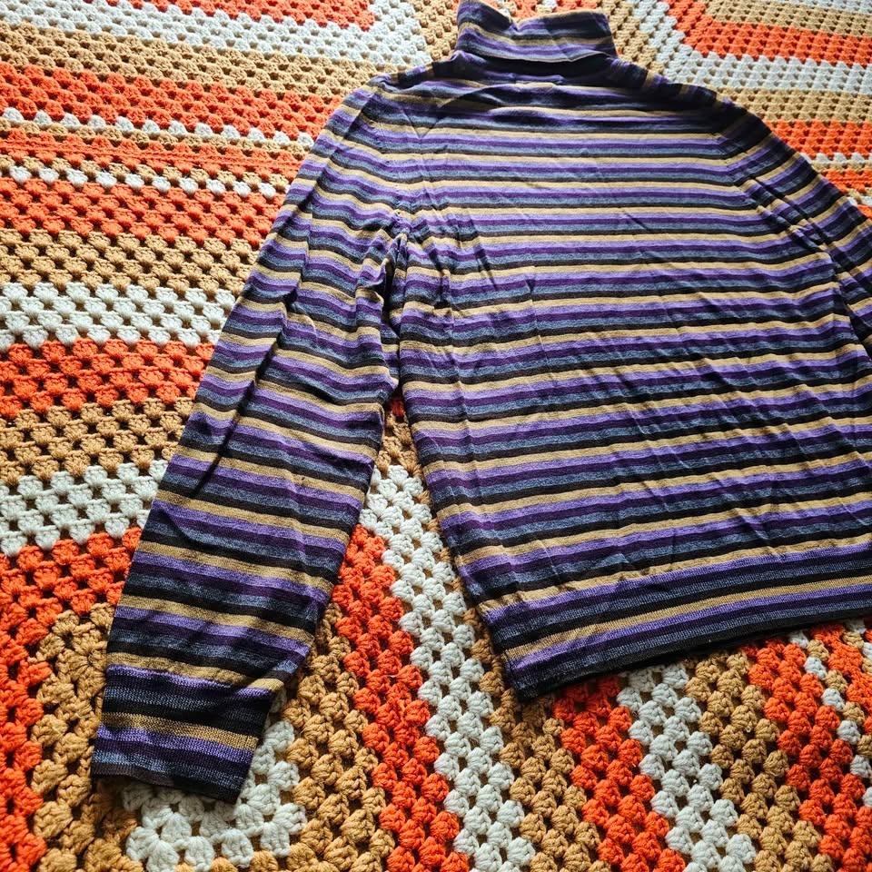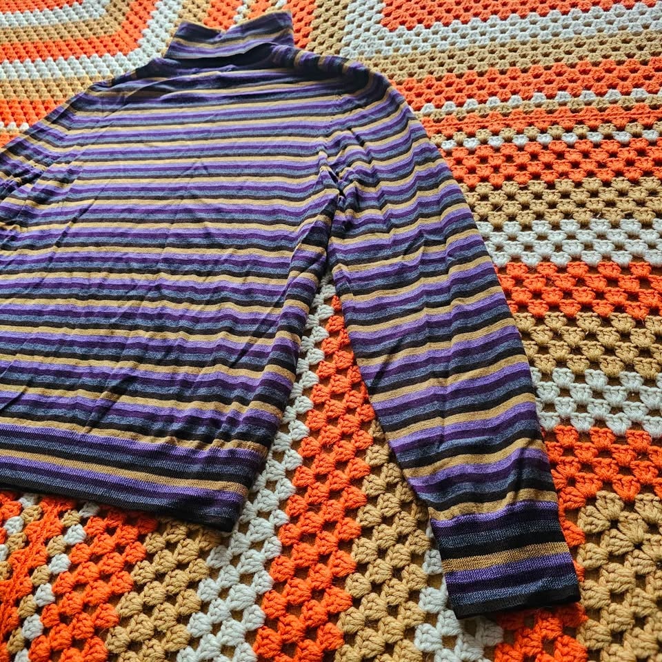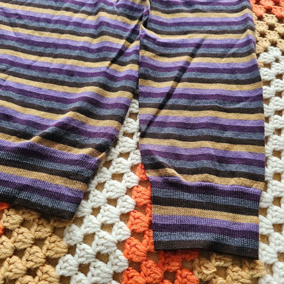 Stylish and warm early 2000s Y2K era 100% merino wool slim fit knit turtleneck sweater from Club Monaco. Made of fine gauge and lightweight but substantial soft merino yarn. Sweater has horizontal stripes in deep plum purple, a lighter lavender purple, mustard yellow, and charcoal grey. A perfect closet staple for layering or wearing on its own.