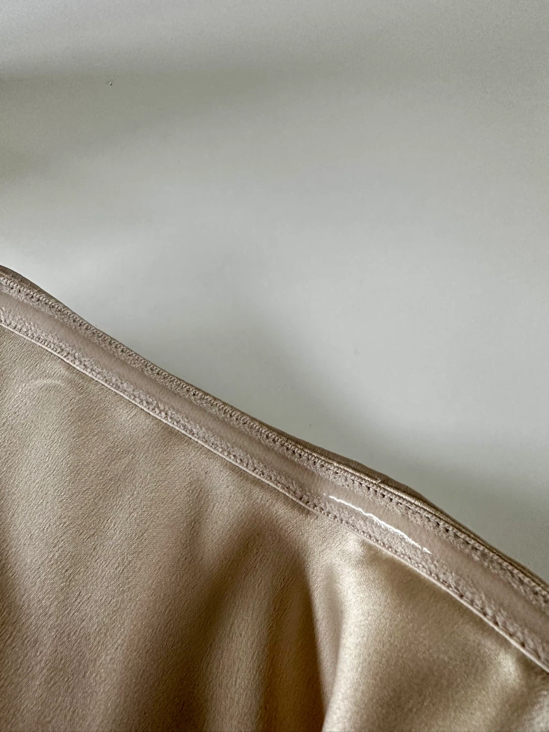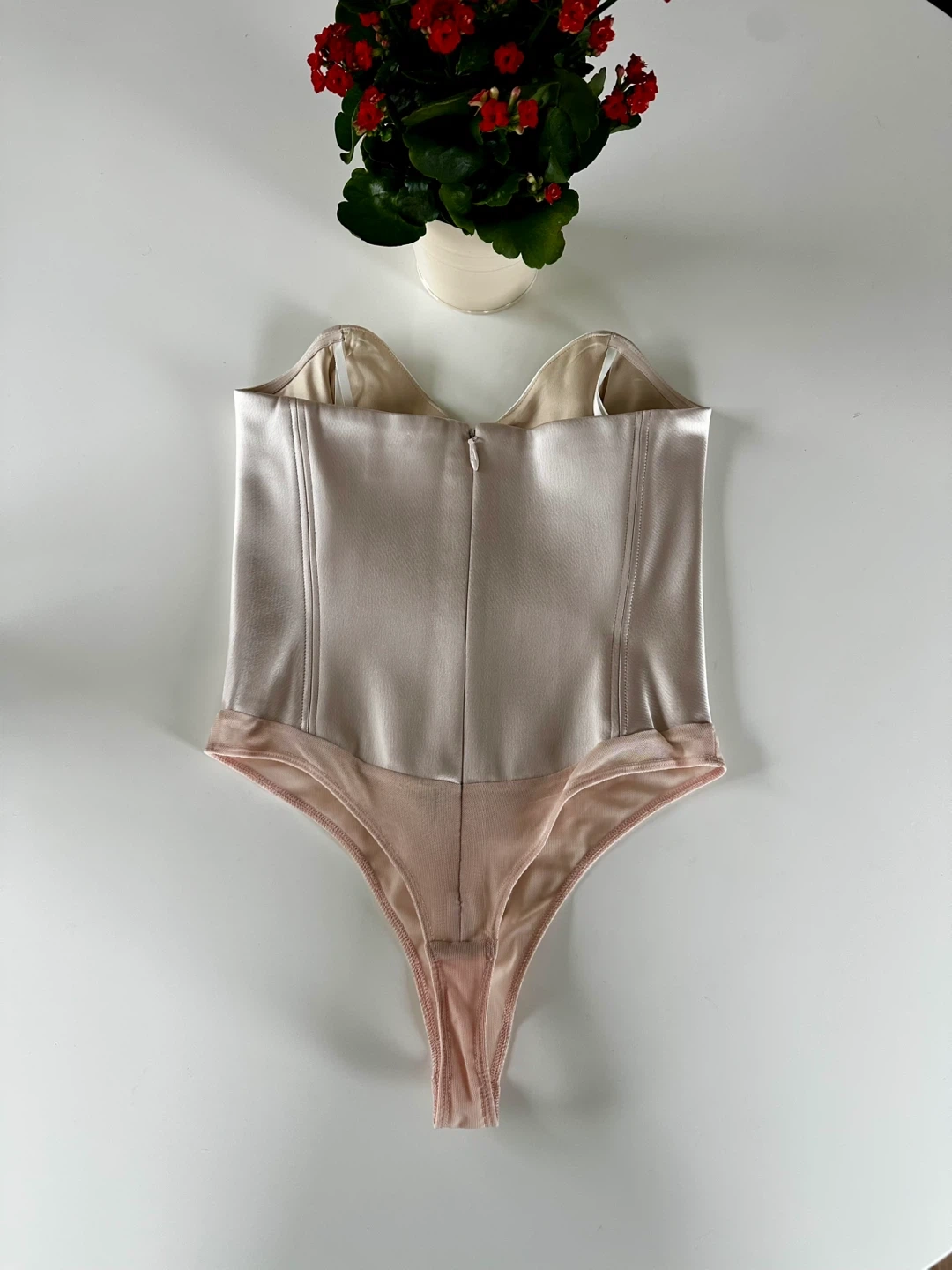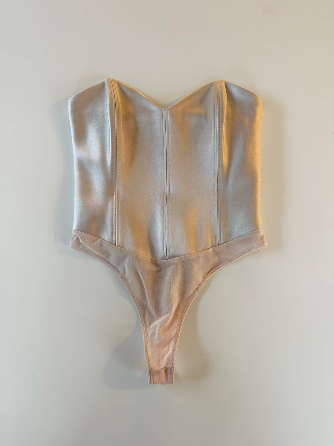 This is a strapless, corset-style bodysuit with a sweetheart neckline, princess seams and a thong-cut bottom. It's made with luxurious, double-faced satin from Japan.