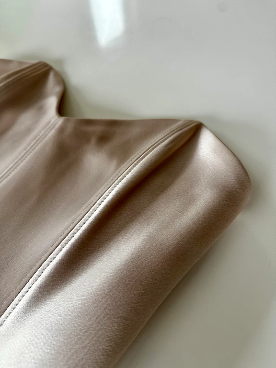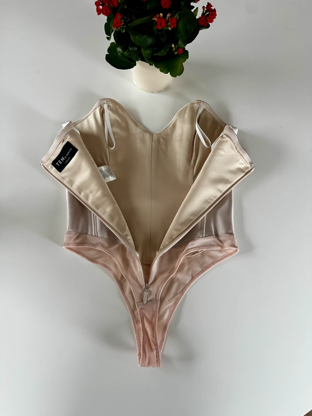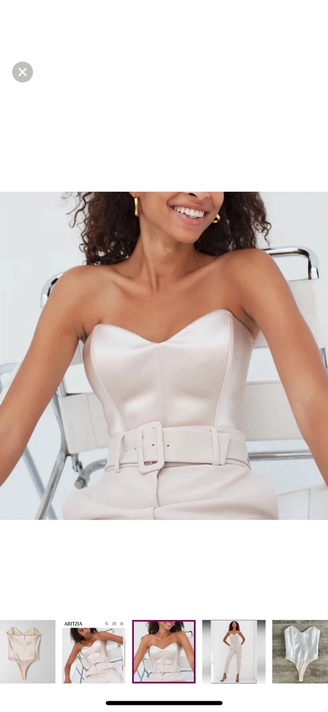This is a strapless, corset-style bodysuit with a sweetheart neckline, princess seams and a thong-cut bottom. It's made with luxurious, double-faced satin from Japan.