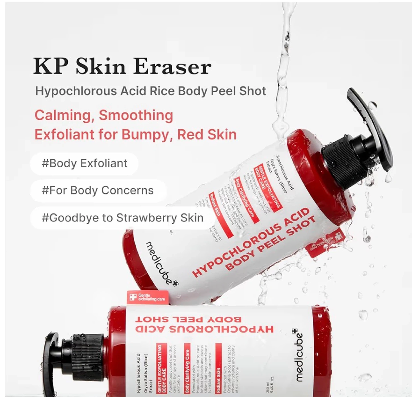 Gentle exfoliating body care formulated with Hypochlorous Acid and Oryza Sativa (Rice) Extract. It's designed to clarify skin and refine rough texture, addressing concerns like ingrown hairs and strawberry skin. 280 ml (9.46 fl. oz.) bottle.