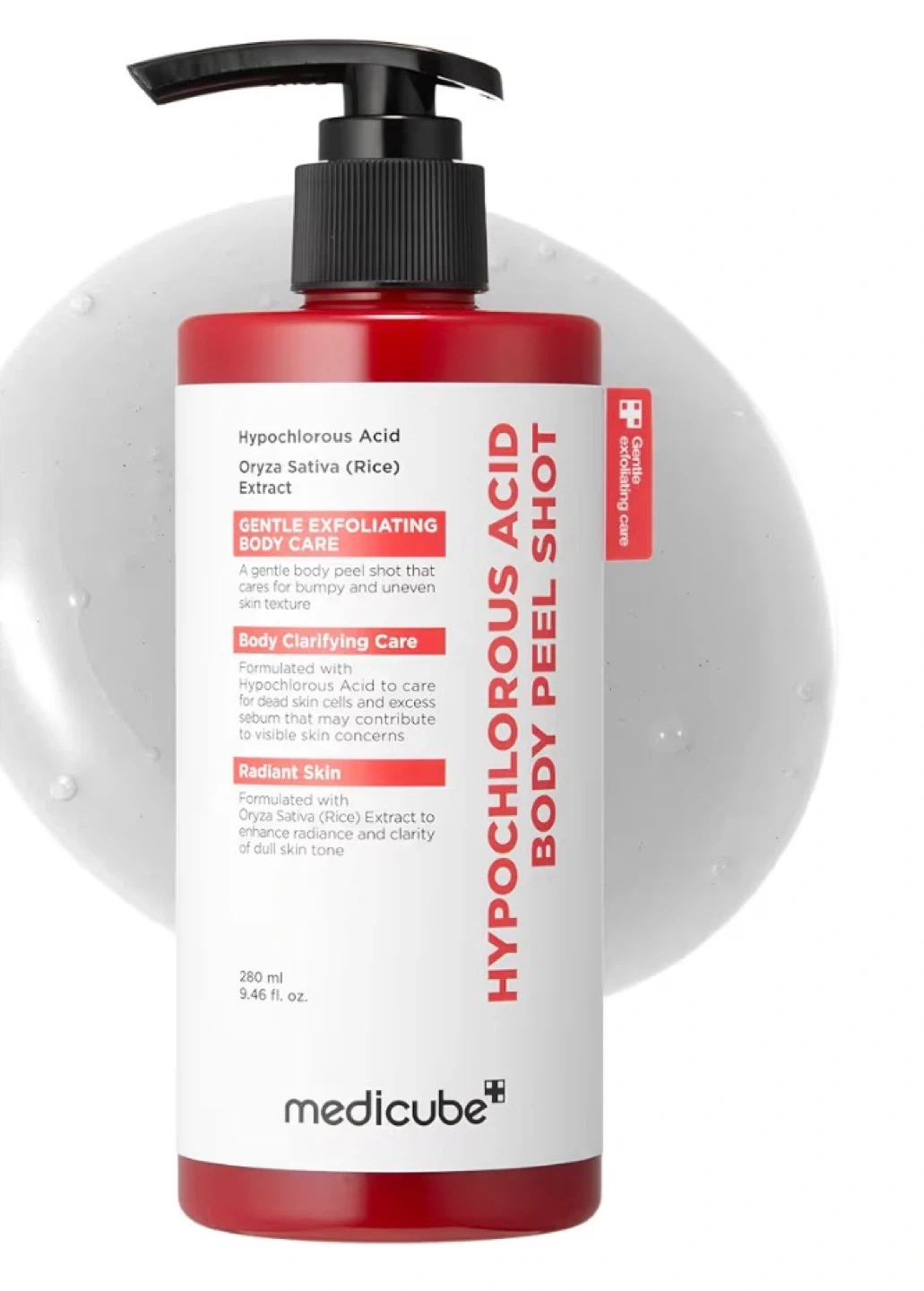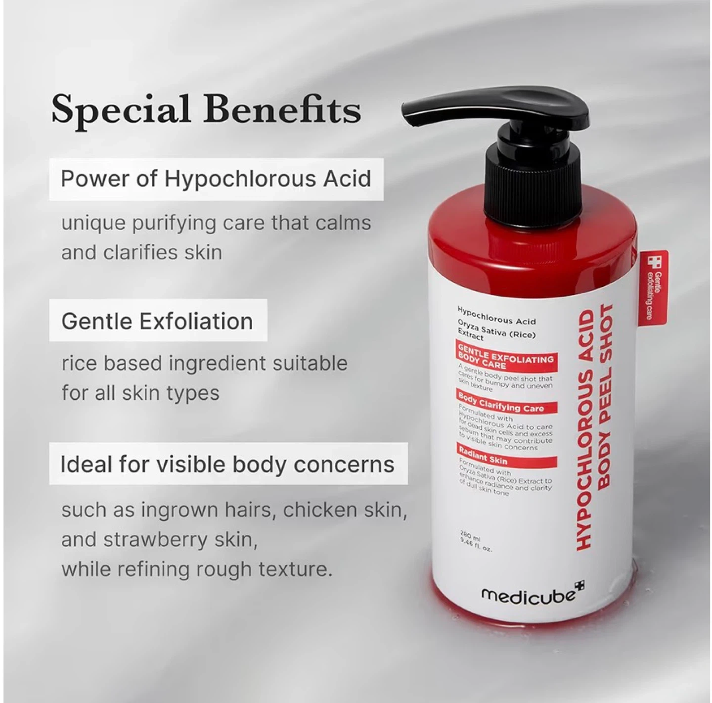 Gentle exfoliating body care formulated with Hypochlorous Acid and Oryza Sativa (Rice) Extract. It's designed to clarify skin and refine rough texture, addressing concerns like ingrown hairs and strawberry skin. 280 ml (9.46 fl. oz.) bottle.