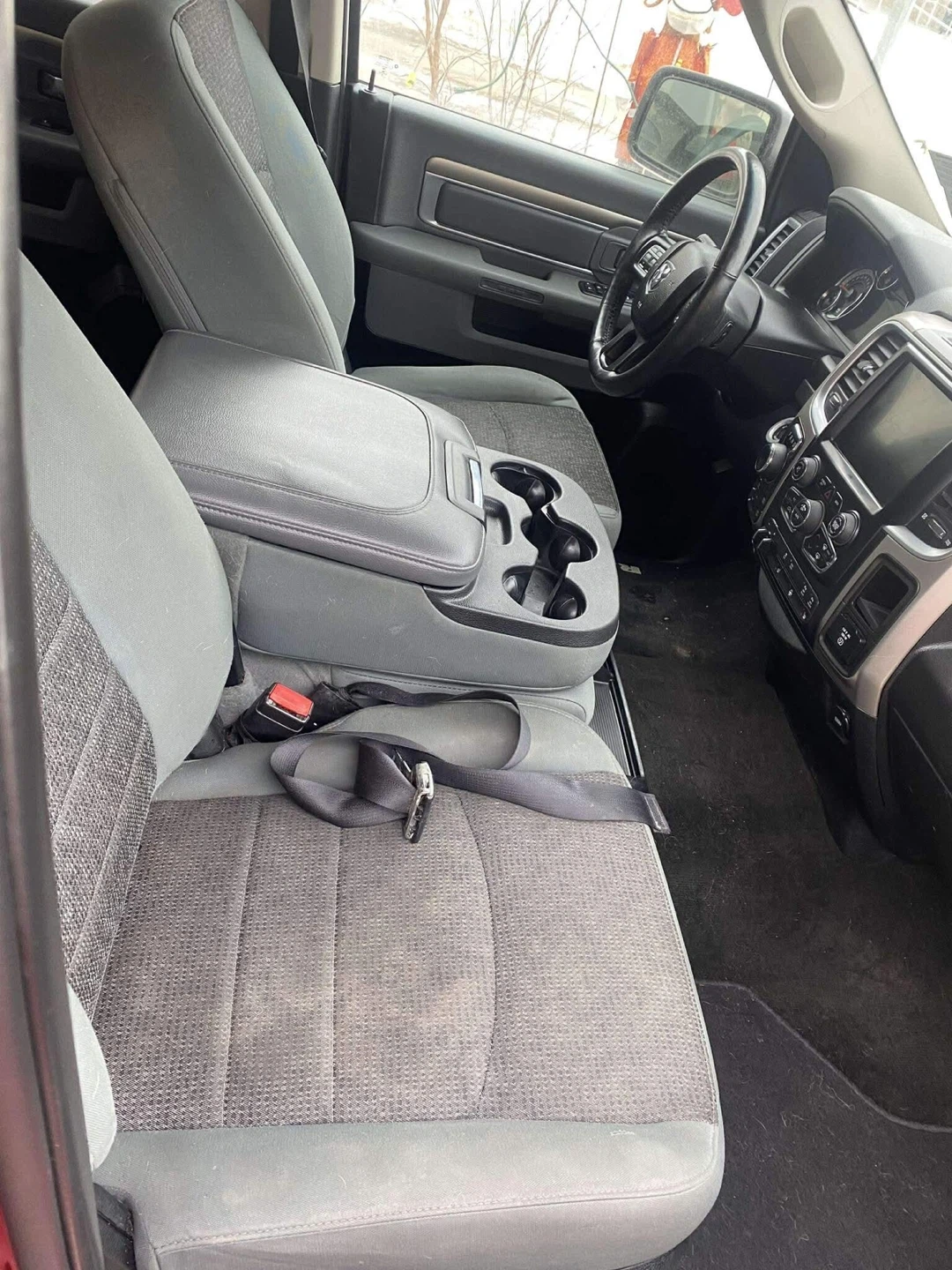 Spacious 2017 Dodge Ram 1500 pickup truck. Has 177,873 km. Red exterior. Interior has grey fabric seats. Dash has a touchscreen system,