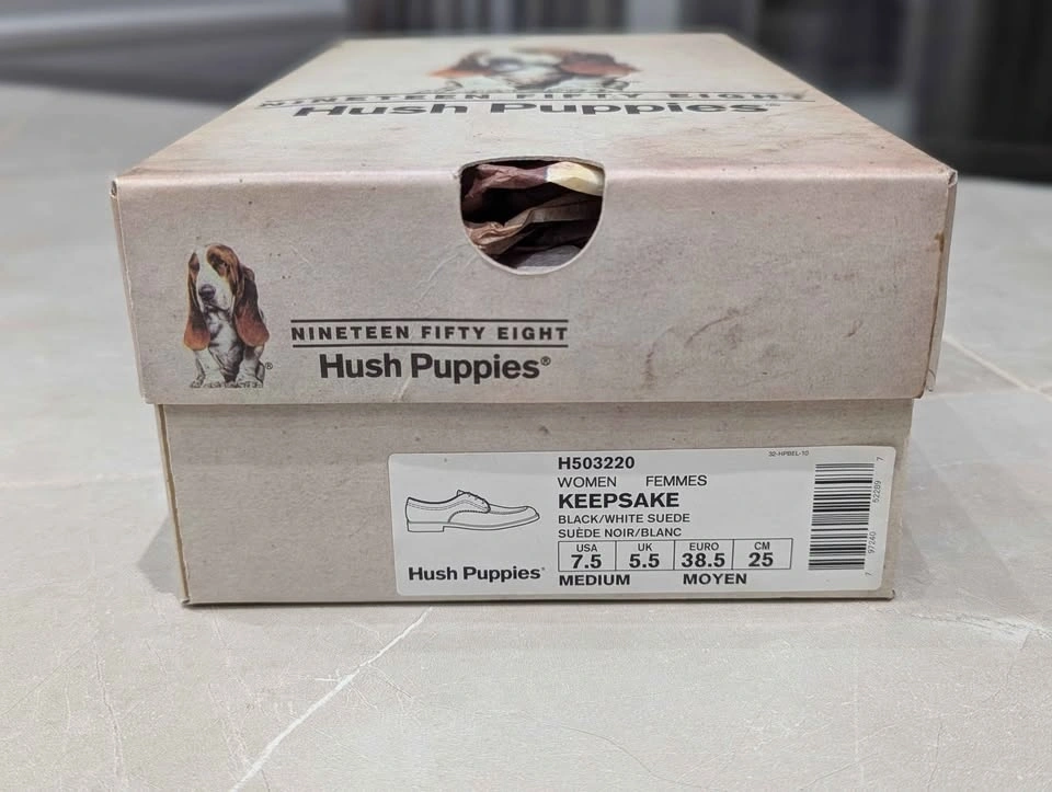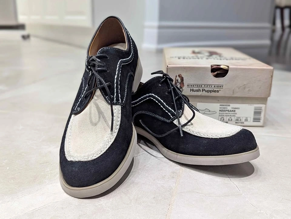 Stylish Hush Puppies Keepsake oxfords in women’s size US 7.5. Classic black and white design with suede leather uppers. Medium width for a comfortable fit. Timeless lace-up style that pairs effortlessly with both casual and dressy looks. Comes in original box.
