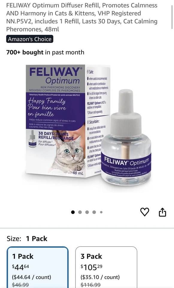 0Feliway Optimum refill. Still in original packaging, never used. Expiry date on box looks like Dec 2026. Price is firm. Doorstep pick up in Millrise (SW).